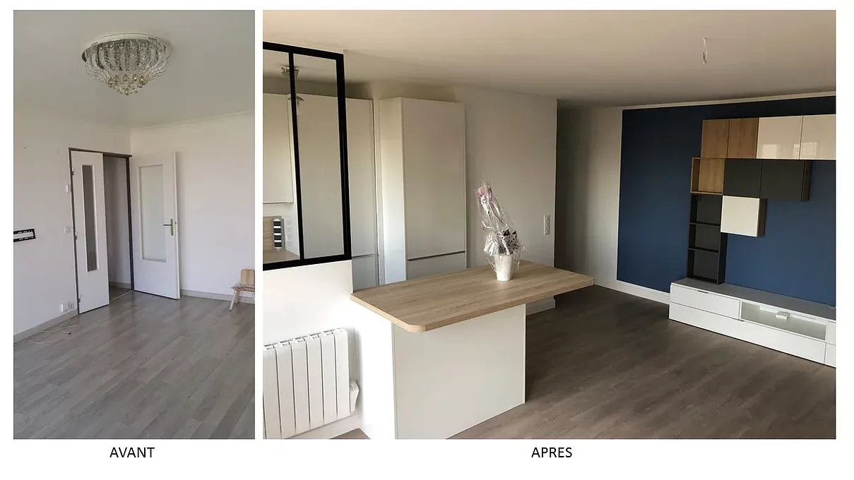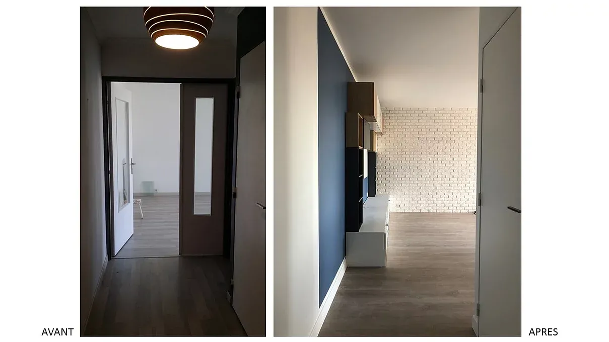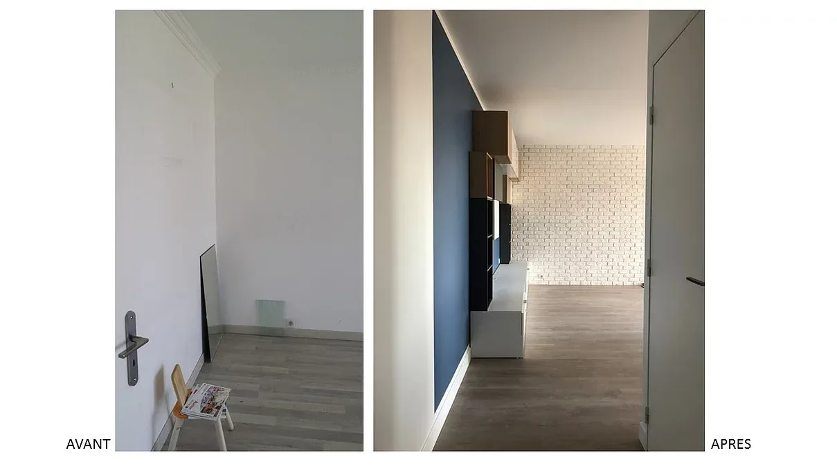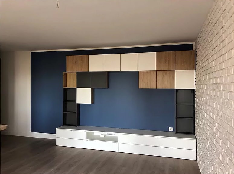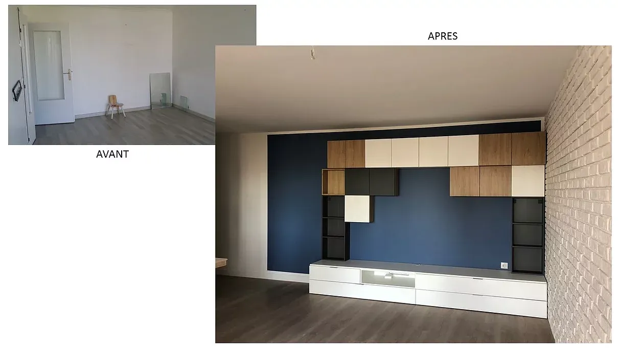 La peinture a été repensée donnant place à un beau mur bleu pigeon qui met en valeur le mobilier bibliothèque /meuble TV créé dans le séjour.