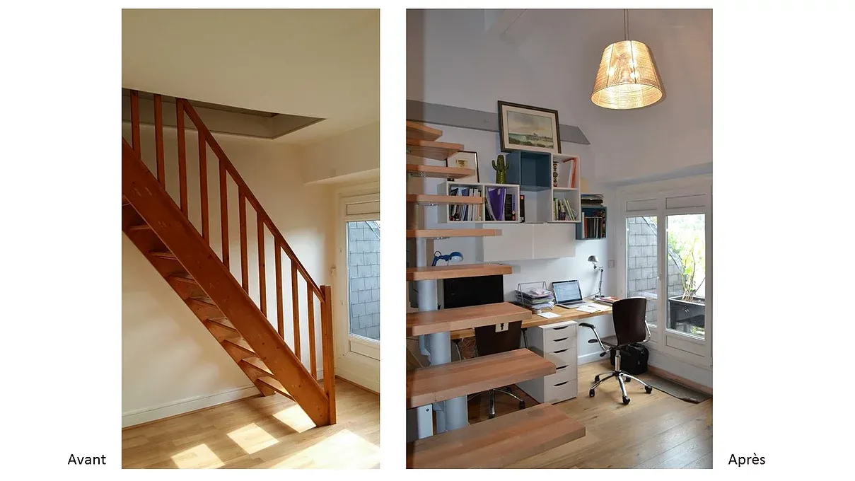 - La chambre qui permet l’accès au deuxième étage a été complètement métamorphosée, car il y avait une hauteur standard avec au-dessus un rangement très mal organisé ou on devait pratiquement se déplacer à quatre pattes, donc, se plancher a été éliminé pour modifier le sens de l'escalier et créer un bureau très agréable et fonctionnel.