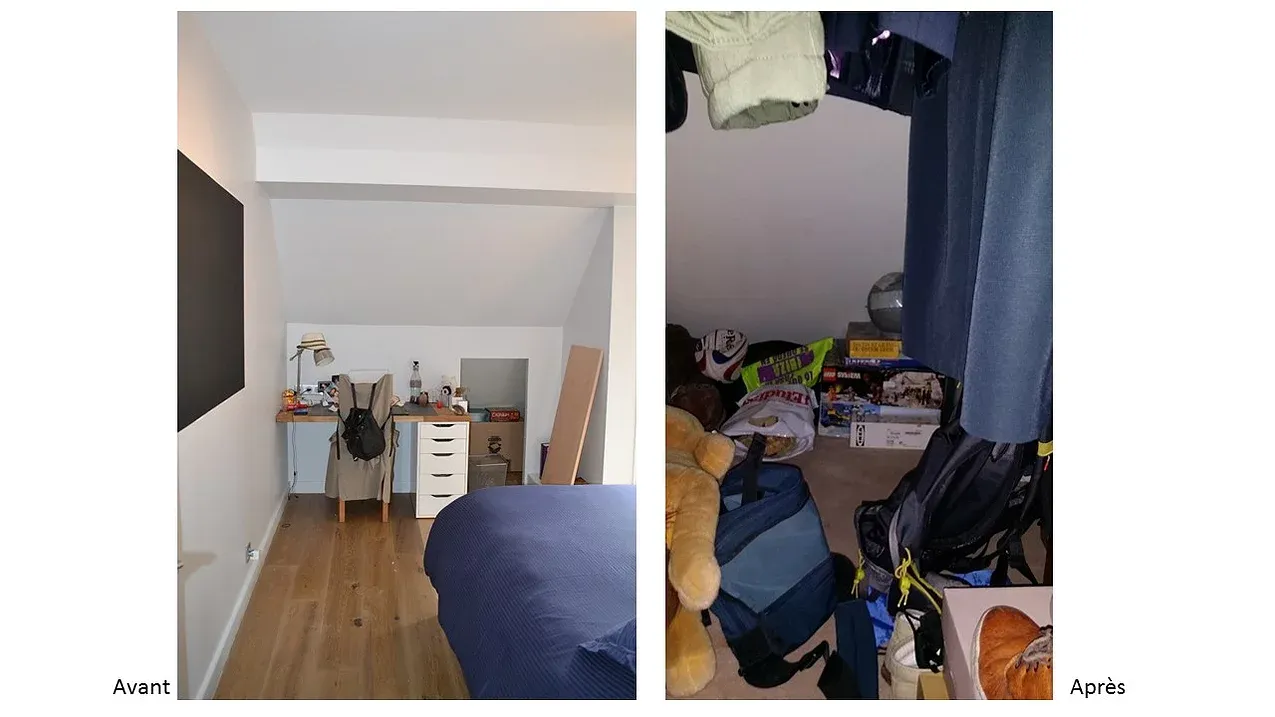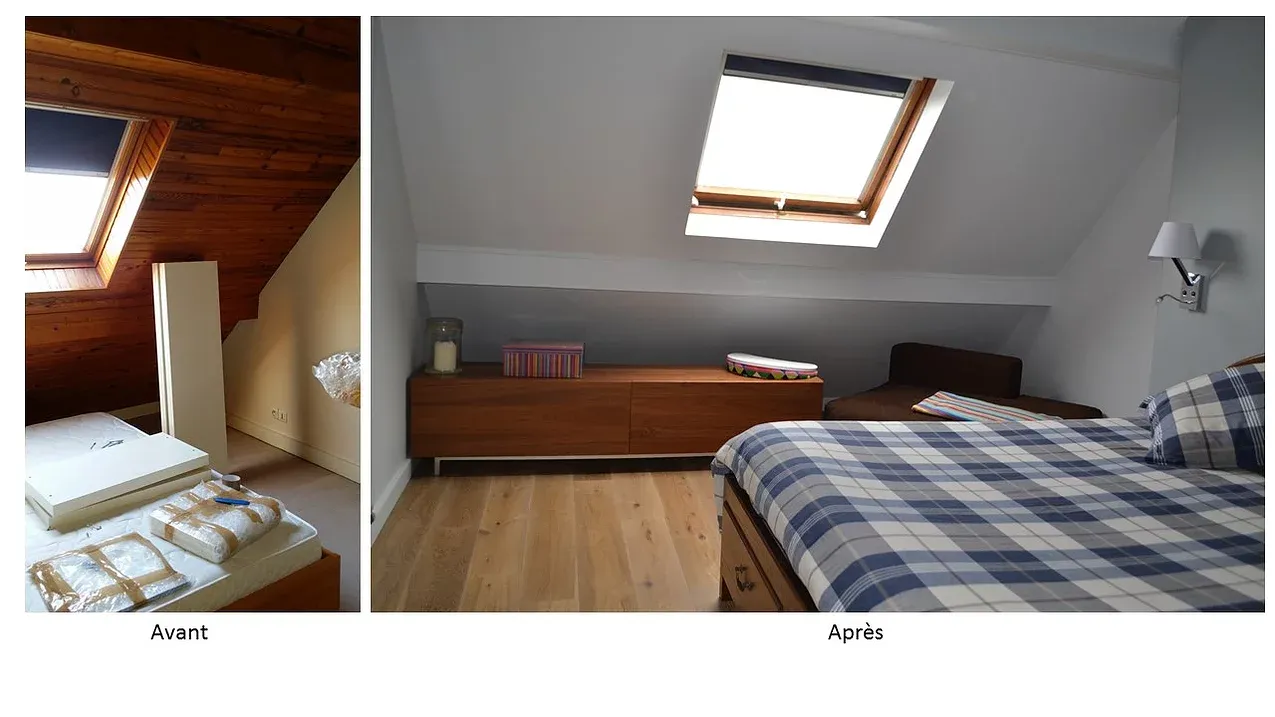 - Dans la chambre des parents une gaine technique a été élargie pour laisser place à la taille du lit. Dans cette prolongation des niches ont été créées. Le lambris a été conservé mais repeint en blanc.
