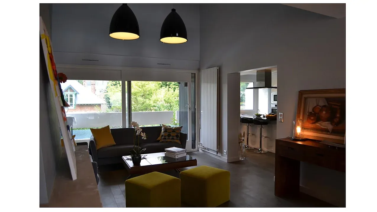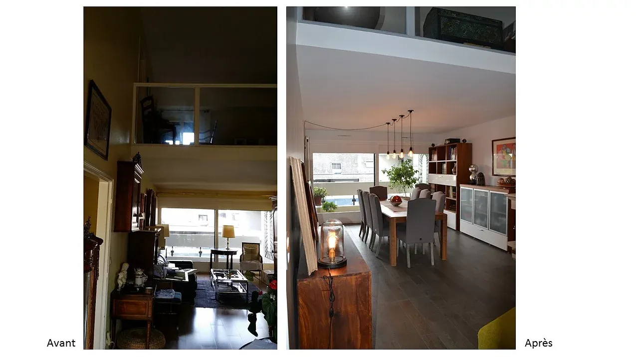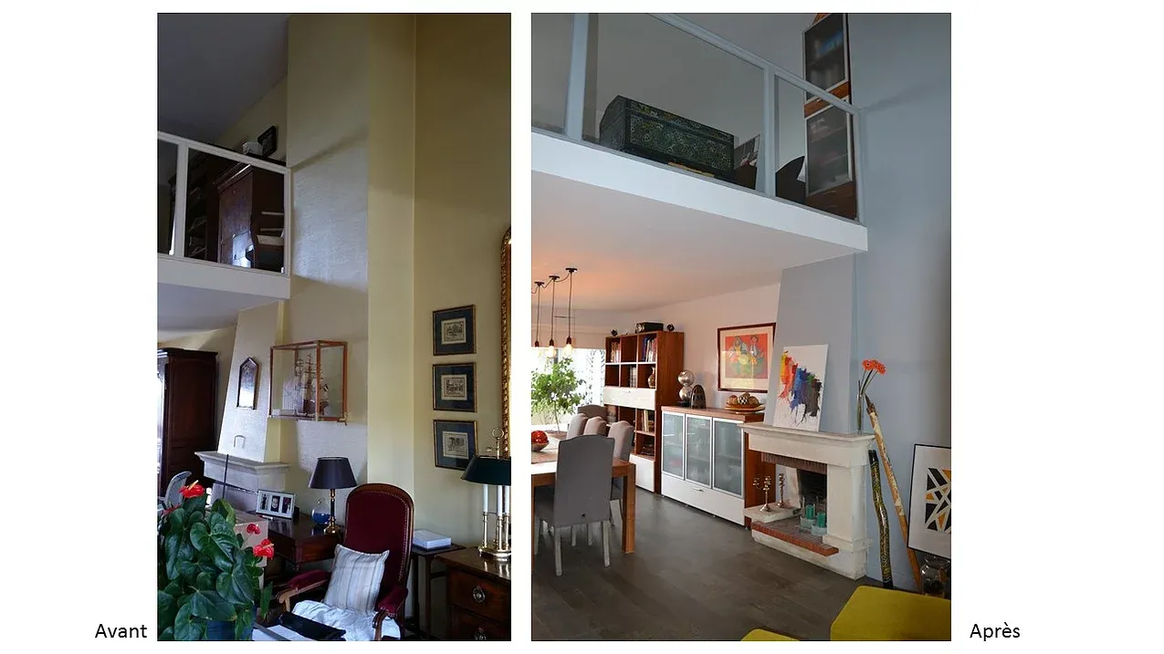 - La partie cheminée a été rajeuni puis un éclairage toute hauteur dans le séjour de 7m de haut a été créé pour accentuer cette belle verticalité.