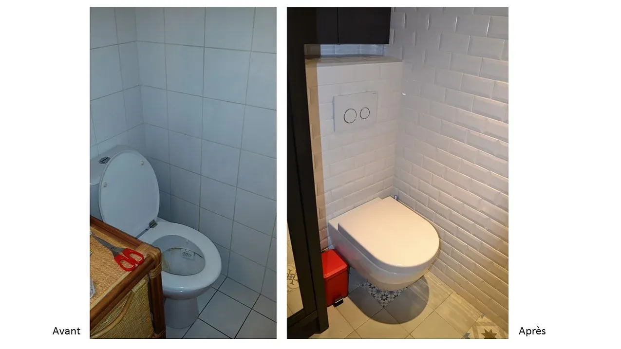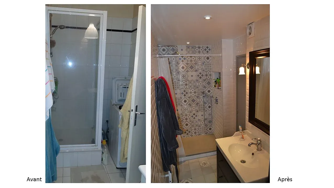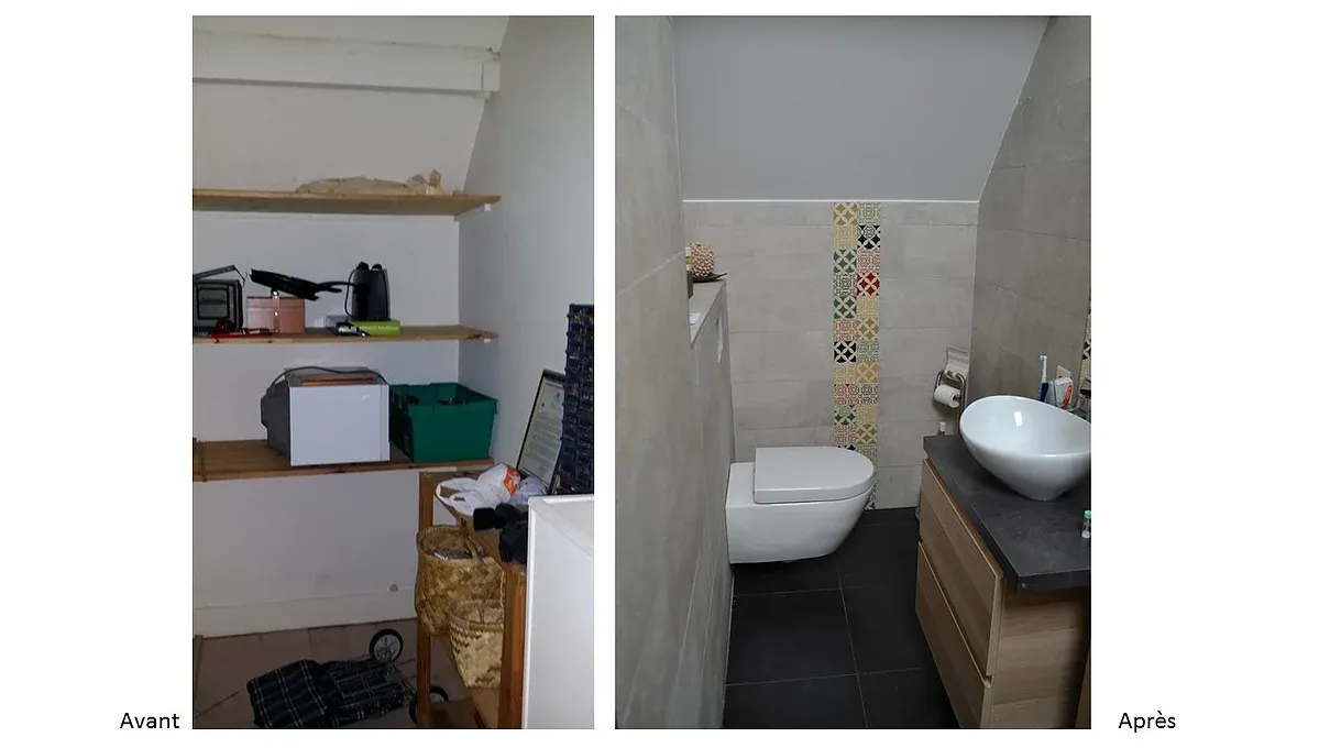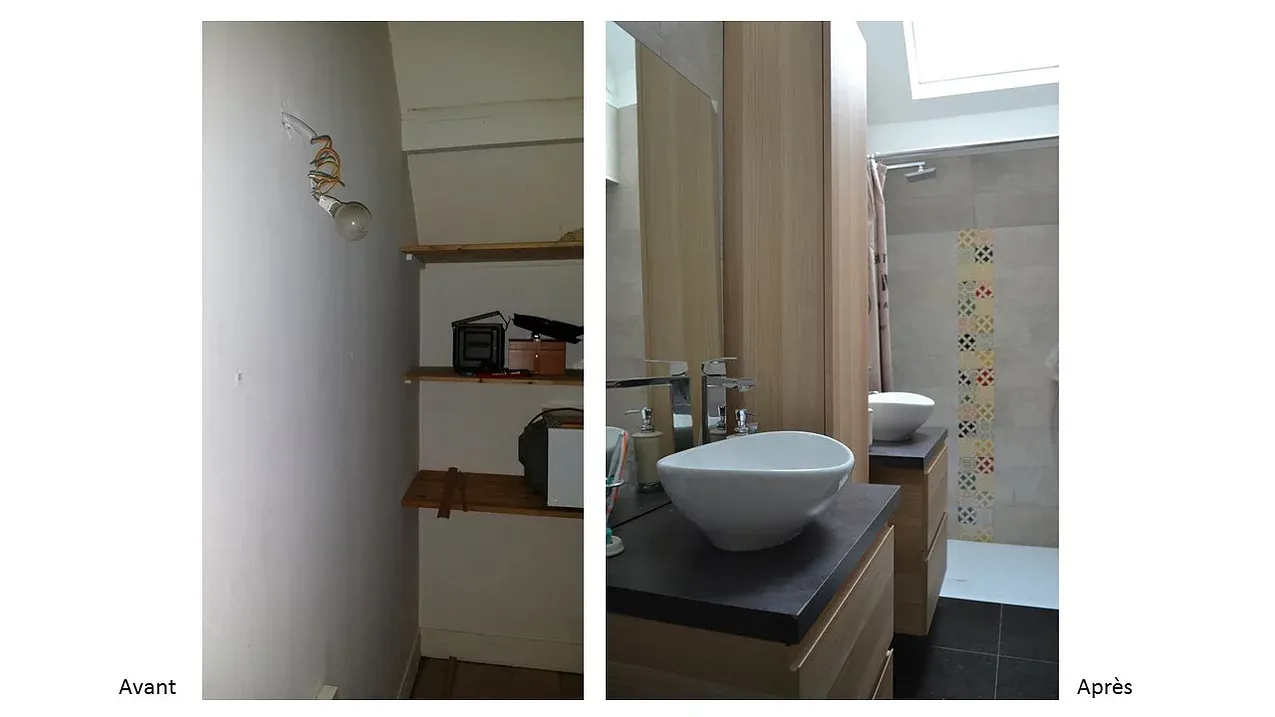 - Un petit débarras sur la salle d'eau du premier étage a été transformé en salle d'eau pour transformer le deuxième étage en suite parentale. Un Velux a été créé dans cette pièce.