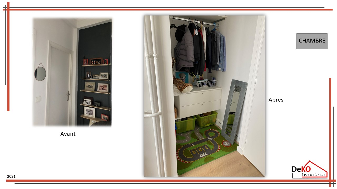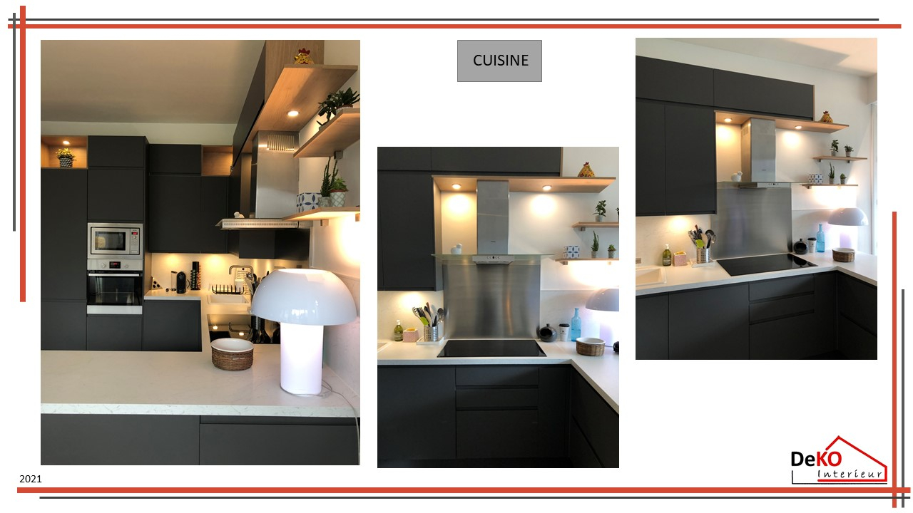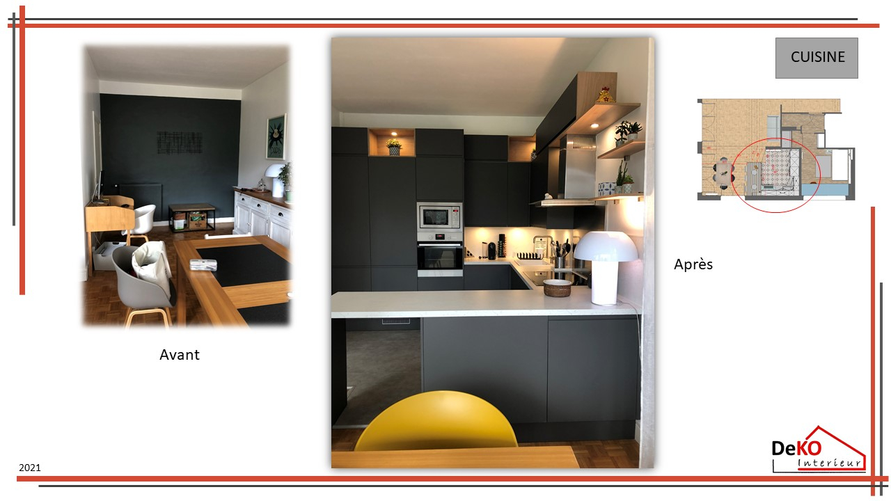 Dans le cadre de la rénovation de cet appartement familial, le projet visant à optimiser l’espace disponible tout en répondant aux besoins évolutifs du foyer. L’objectif principal était de convertir l’ancienne cuisine en une chambre d’enfant fonctionnelle. Pour ce faire, l’idée fut de déplacer la cuisine vers la zone de la salle à manger séjour, qui bénéficiait d’une configuration spacieuse et en forme de L. Cette décision stratégique a permis de libérer l’espace nécessaire pour créer une chambre confortable pour un enfant, tout en transformant la zone adjacente en une cuisine ouverte. Cette nouvelle disposition a apporté une ambiance chaleureuse et conviviale à l’espace de vie, tout en maximisant l’utilisation de chaque centimètre carré disponible. La cuisine, désormais ouverte sur la salle à manger et le séjour, a été aménagée de manière à être à la fois pratique et fonctionnelle. Malgré que la taille du séjour a été légèrement réduite, elle offre tout ce dont ont besoin les clients pour préparer des repas en famille et recevoir des invités. L’aménagement en cuisine ouverte favorise également la communication et les interactions lors des moments passés ensemble. En fin de compte, ce projet de réaménagement a transformé l’appartement familial en un espace moderne, adapté aux besoins changeants, tout en préservant une atmosphère accueillante et conviviale.