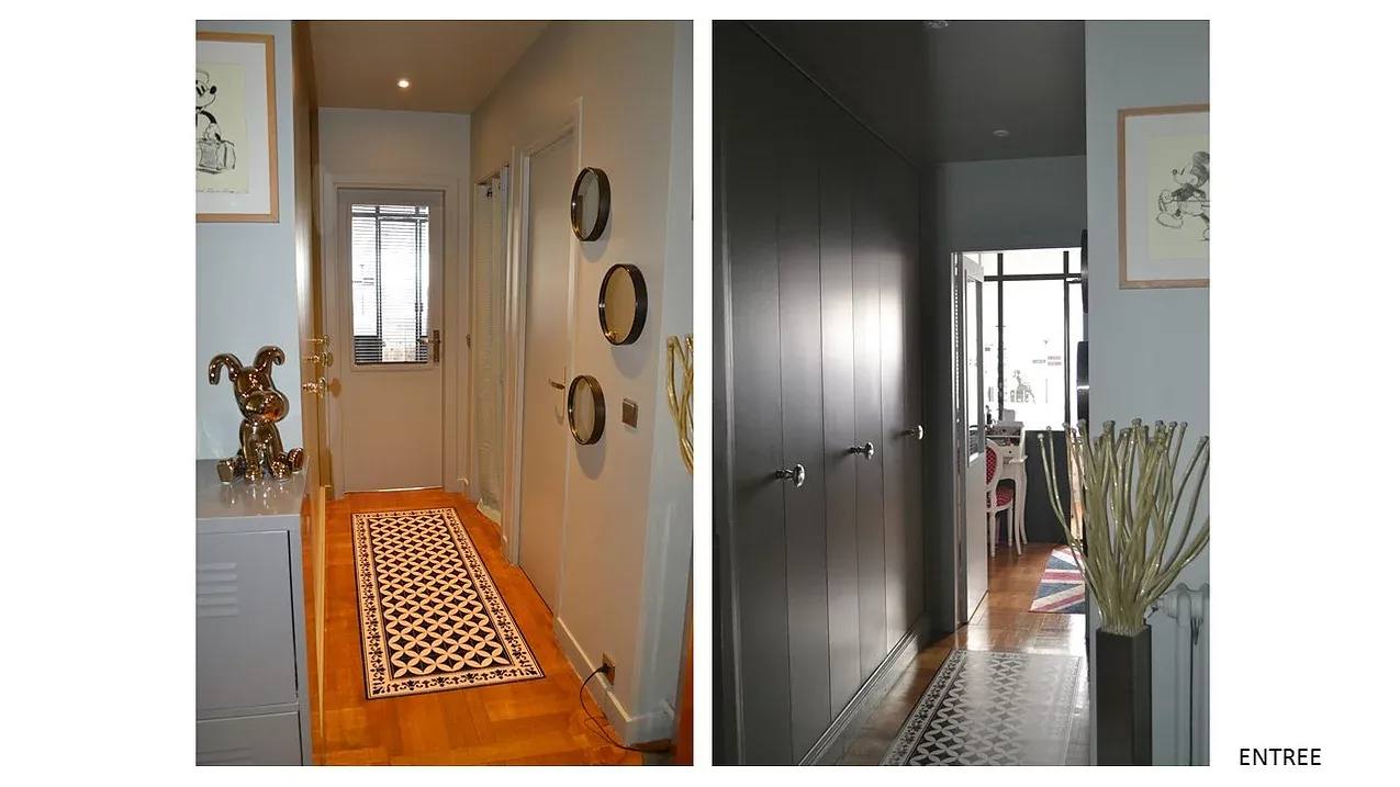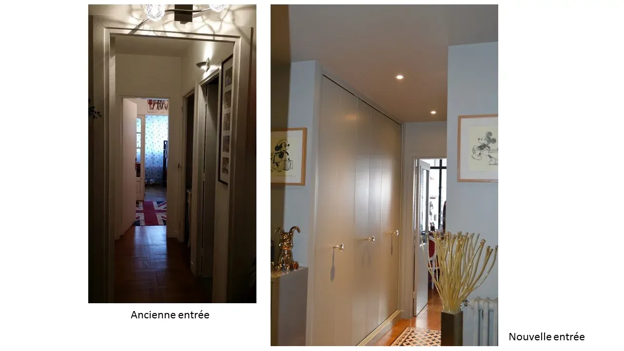 - Un faux plafond a été créé dans l'entrée pour installer des spots et éclairer mieux cet espace lointain des fenêtres.