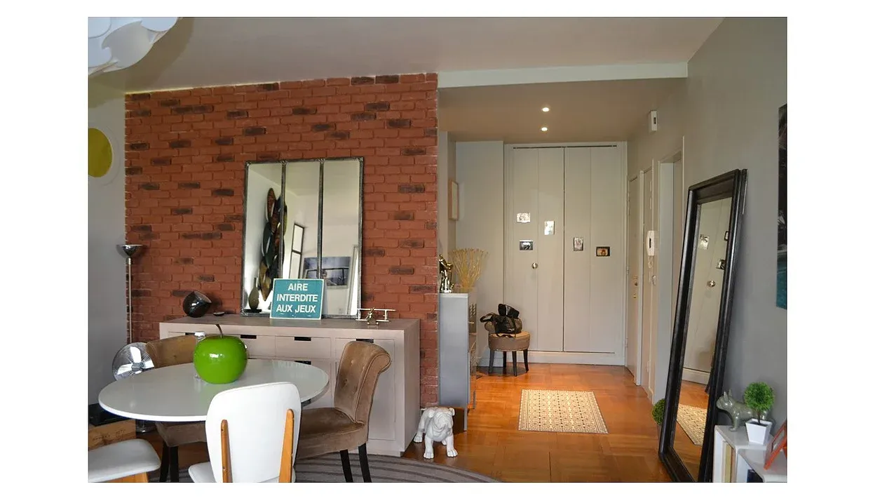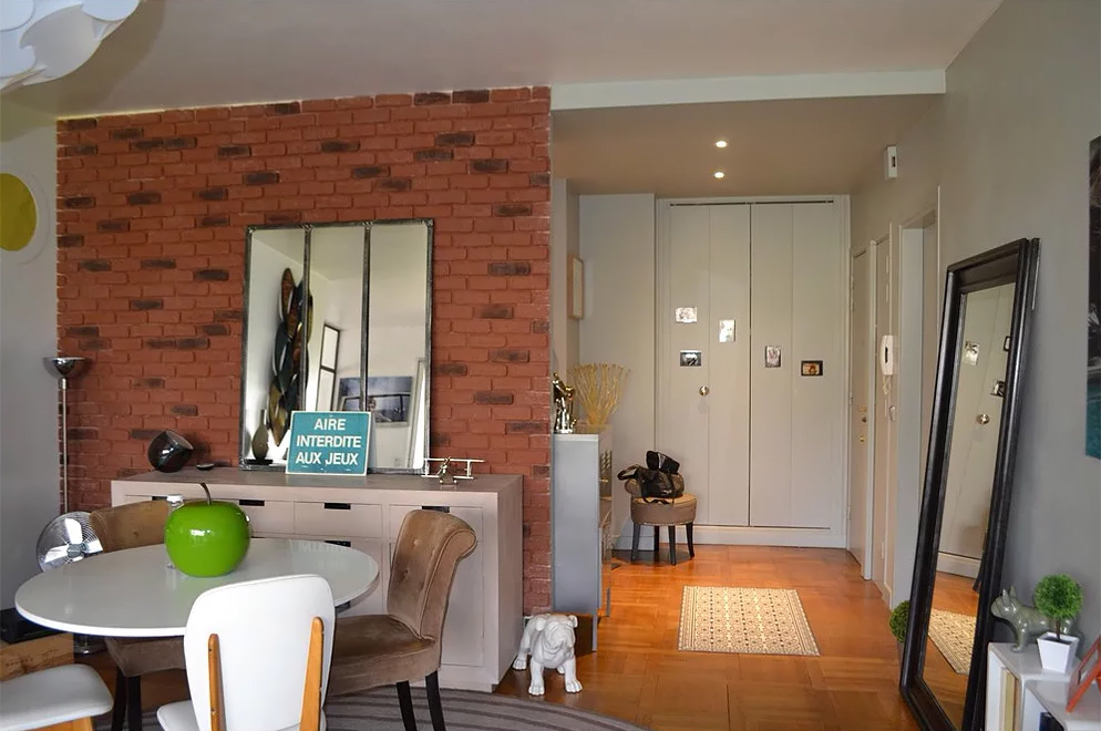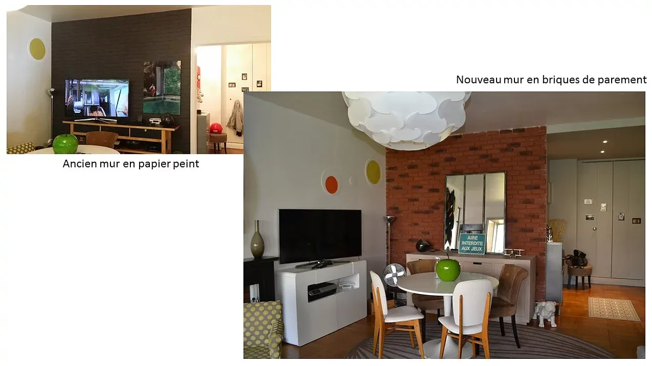 - Un mur de parement en briques rouge a été créé a la place d'un papier peint imitation briques.