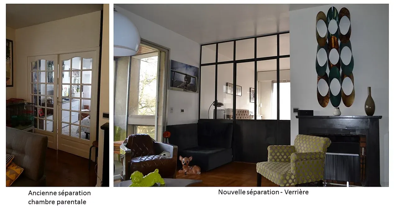 - Une verrière a été créée pour séparer la chambre des parents du séjour, puis une autre pour séparer la chambre des enfants en 2 espaces indépendants en gardant de la luminosité.
