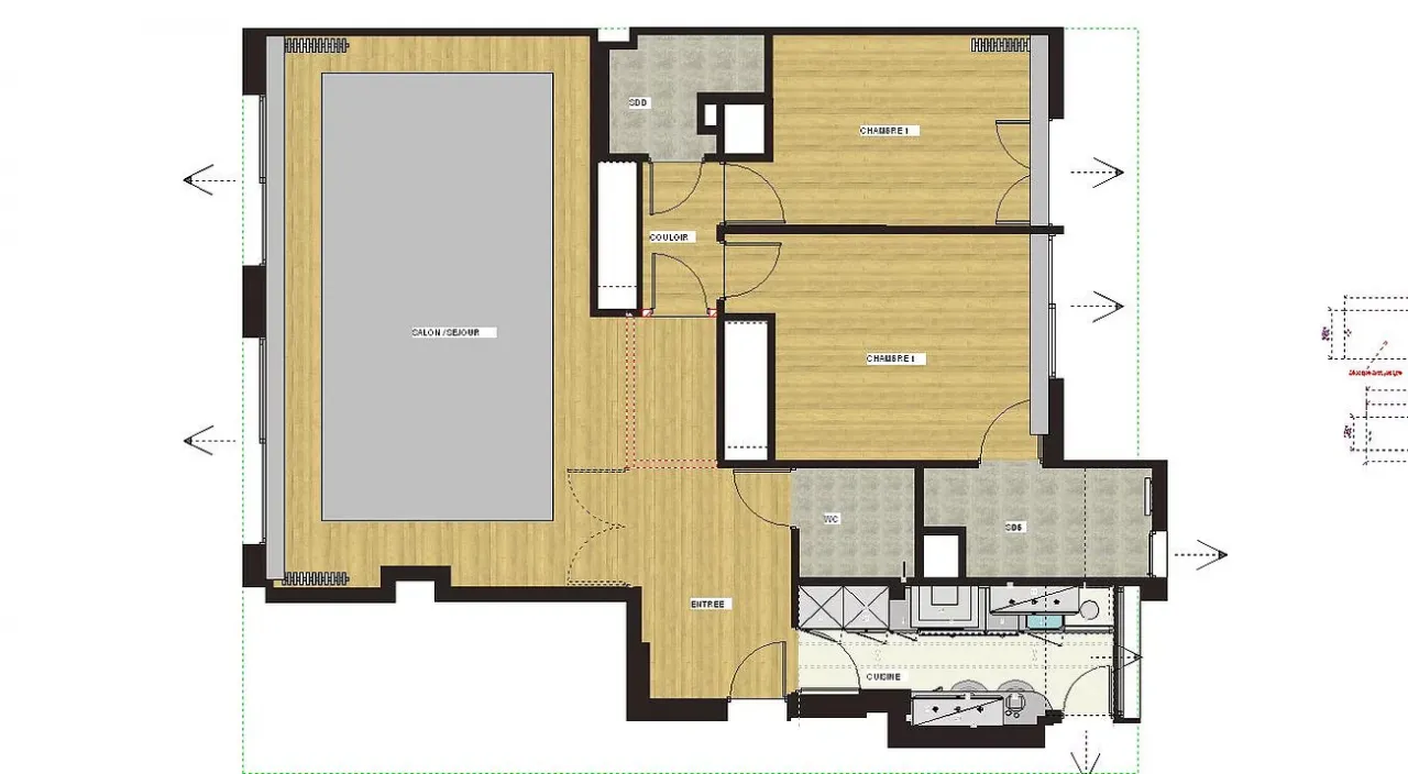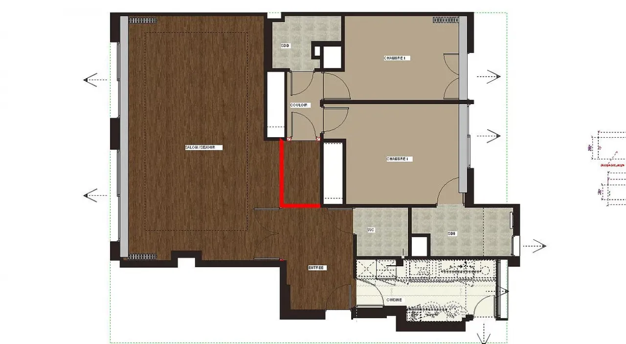 - Éliminer la porte d'accès au séjour pour agrandir l'entrée et l'intégrer au séjour.