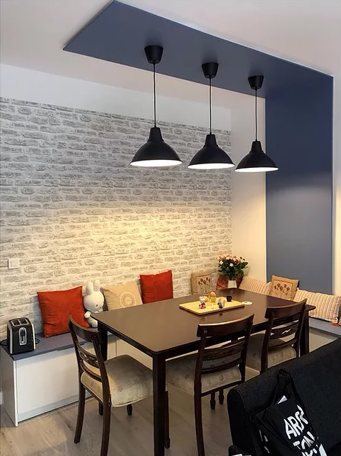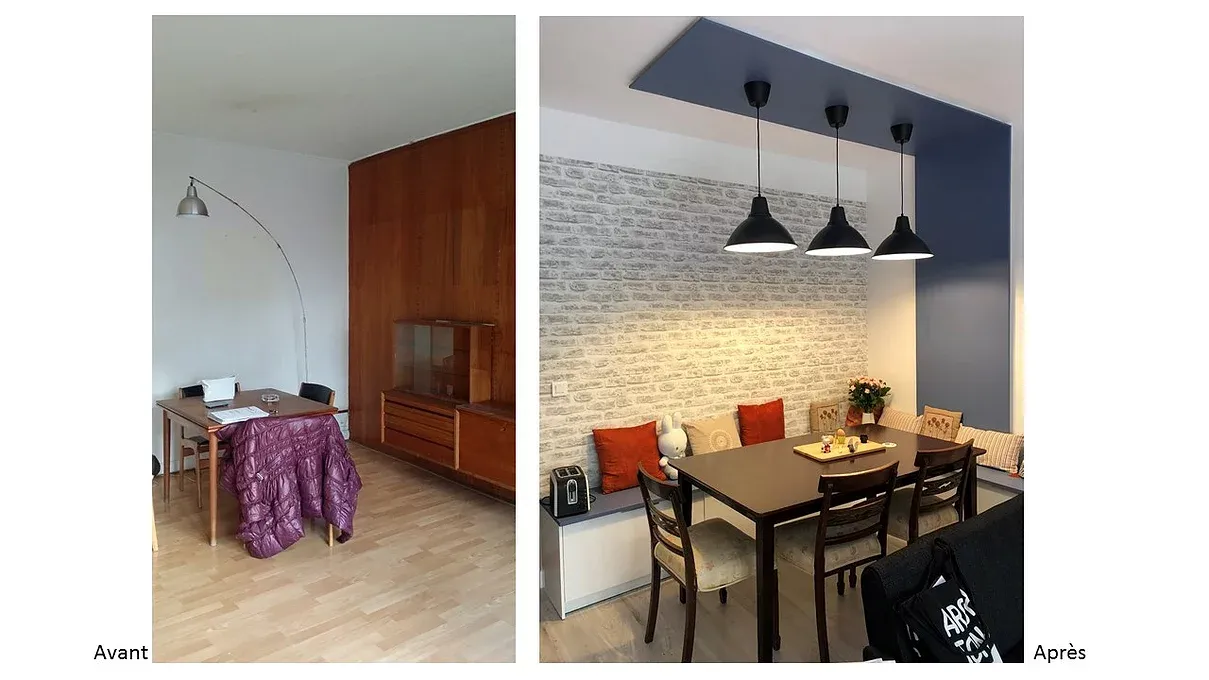 Un coin table et une banquette avec beaucoup de rangements coulissants ont été aménagés côté séjour. Une contrainte d’éclairage a été contournée en créant une structure qui accueille tous les fils d’alimentation pour les 3 suspensions placées au-dessus de la table.