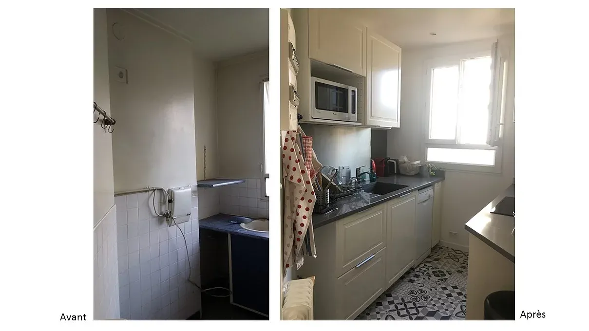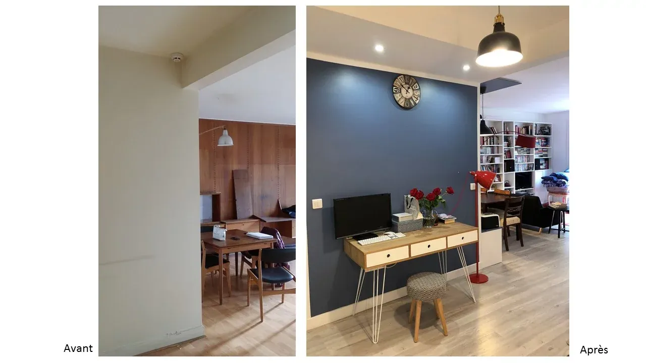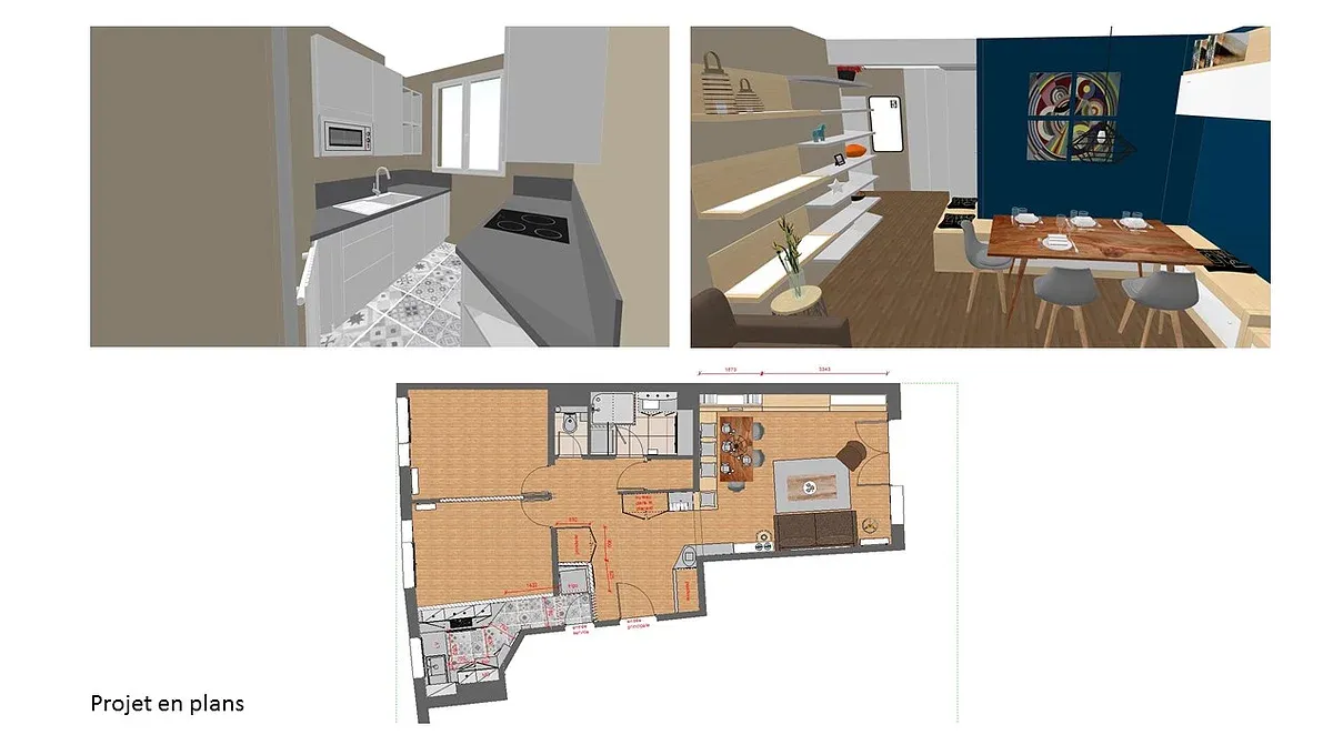Après plusieurs ébauches pour créer une cuisine ouverte, le client s’est décidé pour la laisser à son lieu d’origine mais avec une configuration différente. L’idée était d’exploiter au mieux le plan de travail, puis dégager l’accès en couloir a cette pièce en plaçant une porte à galandage.
