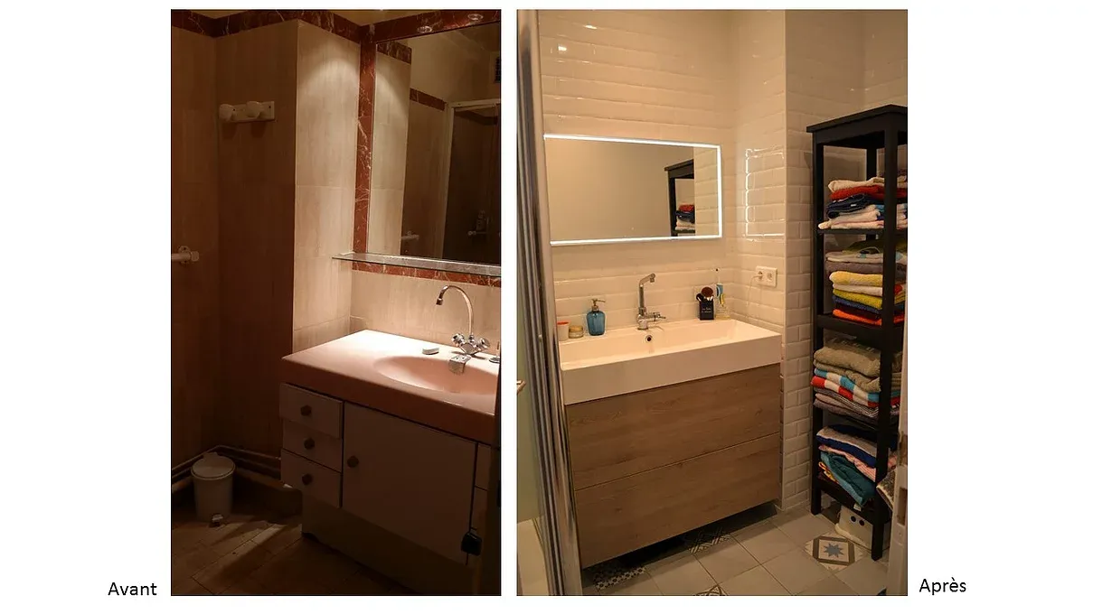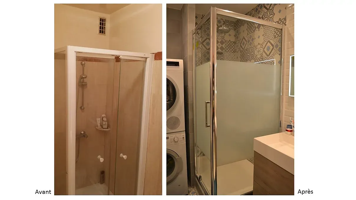La salle d’eau a été complètement repensée et nous y avons même rajouté un coin buanderie.