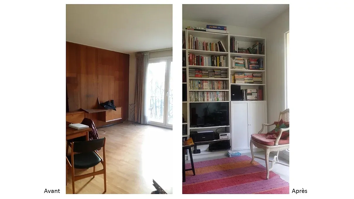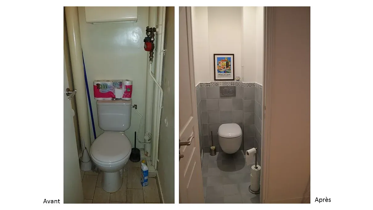 Dans les toilettes, des multiples tuyaux inesthétiques ont été masqués derrière des coffrages, puis une cuve suspendue remplace l’ancienne pièce sanitaire vétuste.