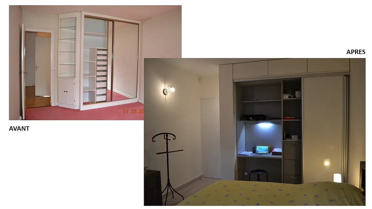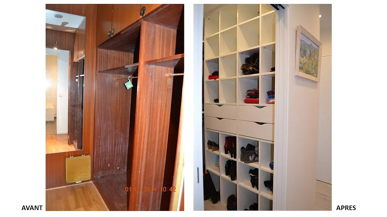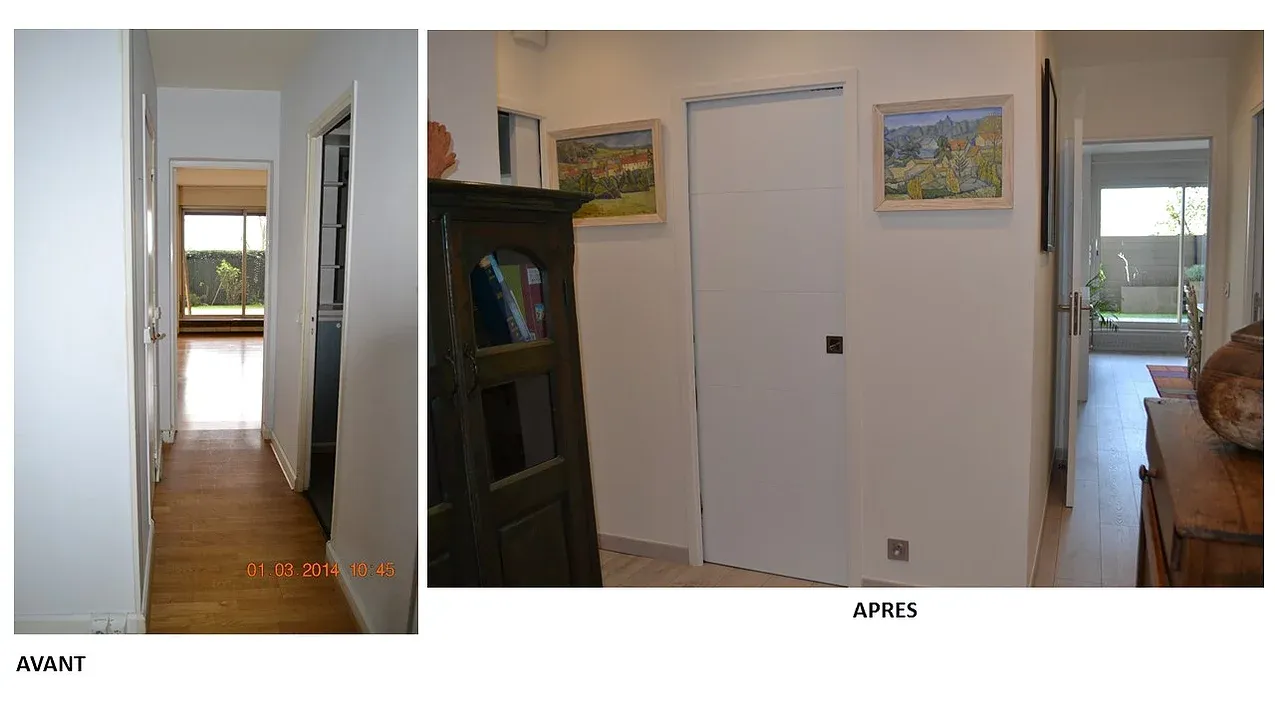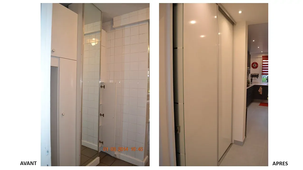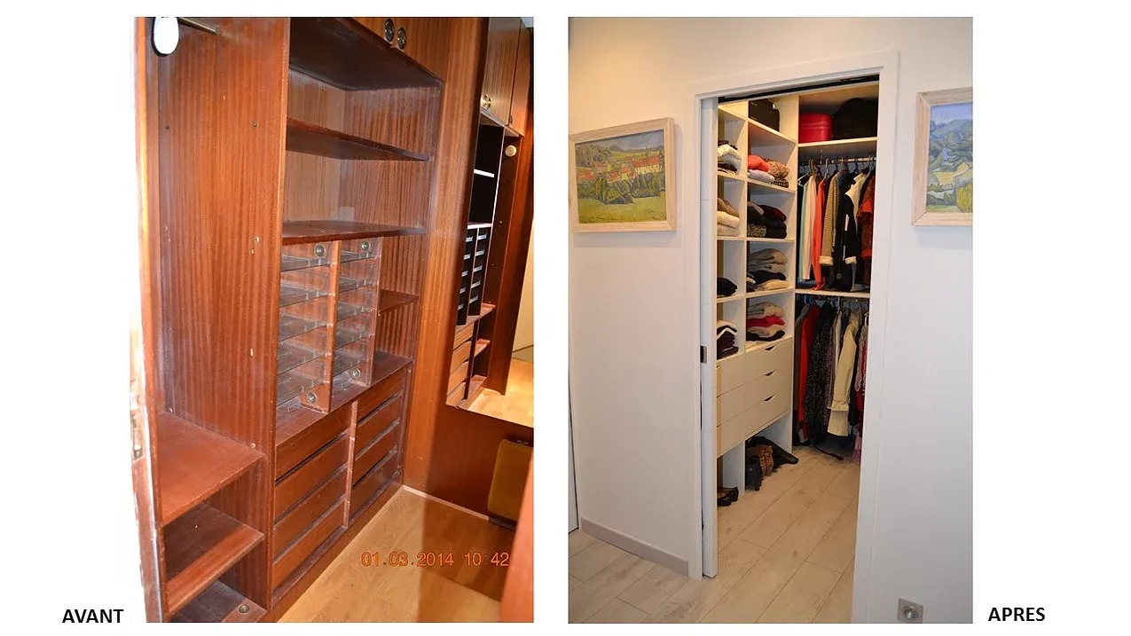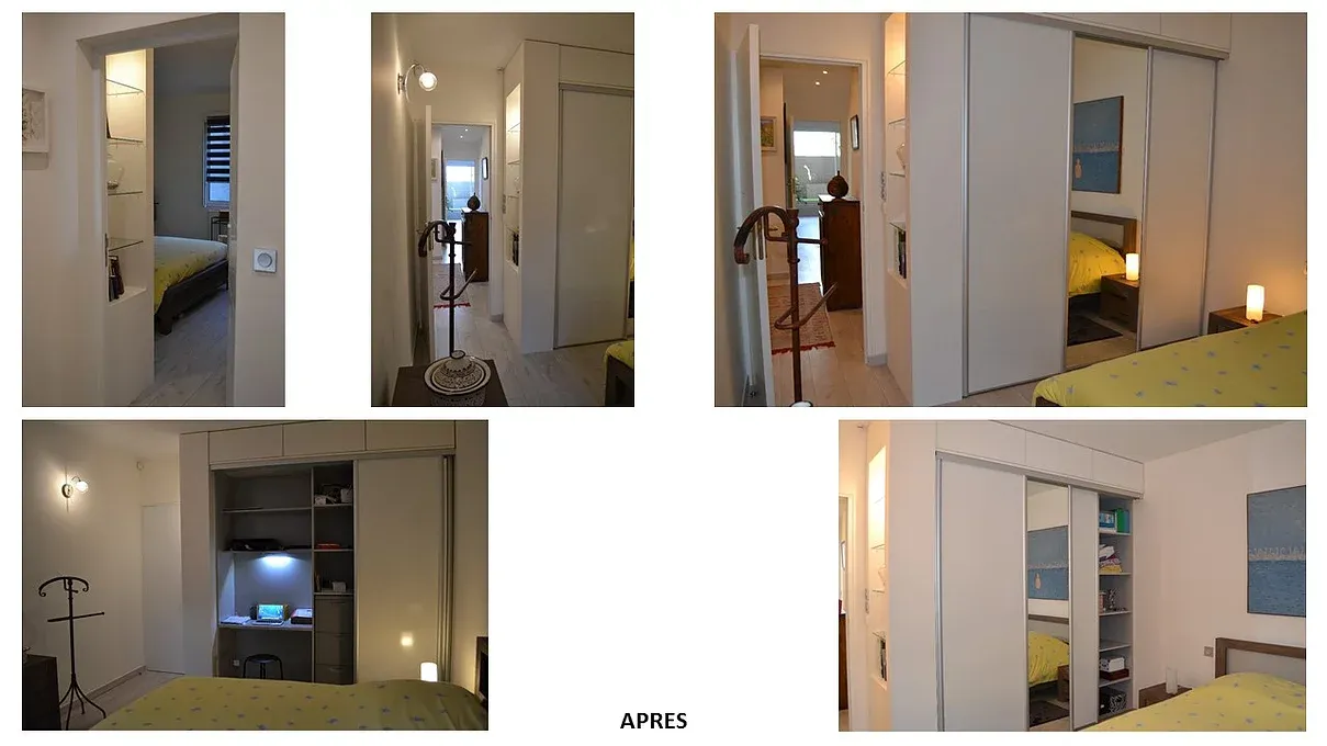 - Le dressing agrandi et son accès modifié. La porte avant ouvrante a été remplacée par une coulissante.