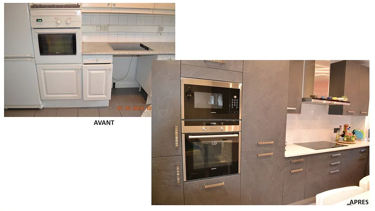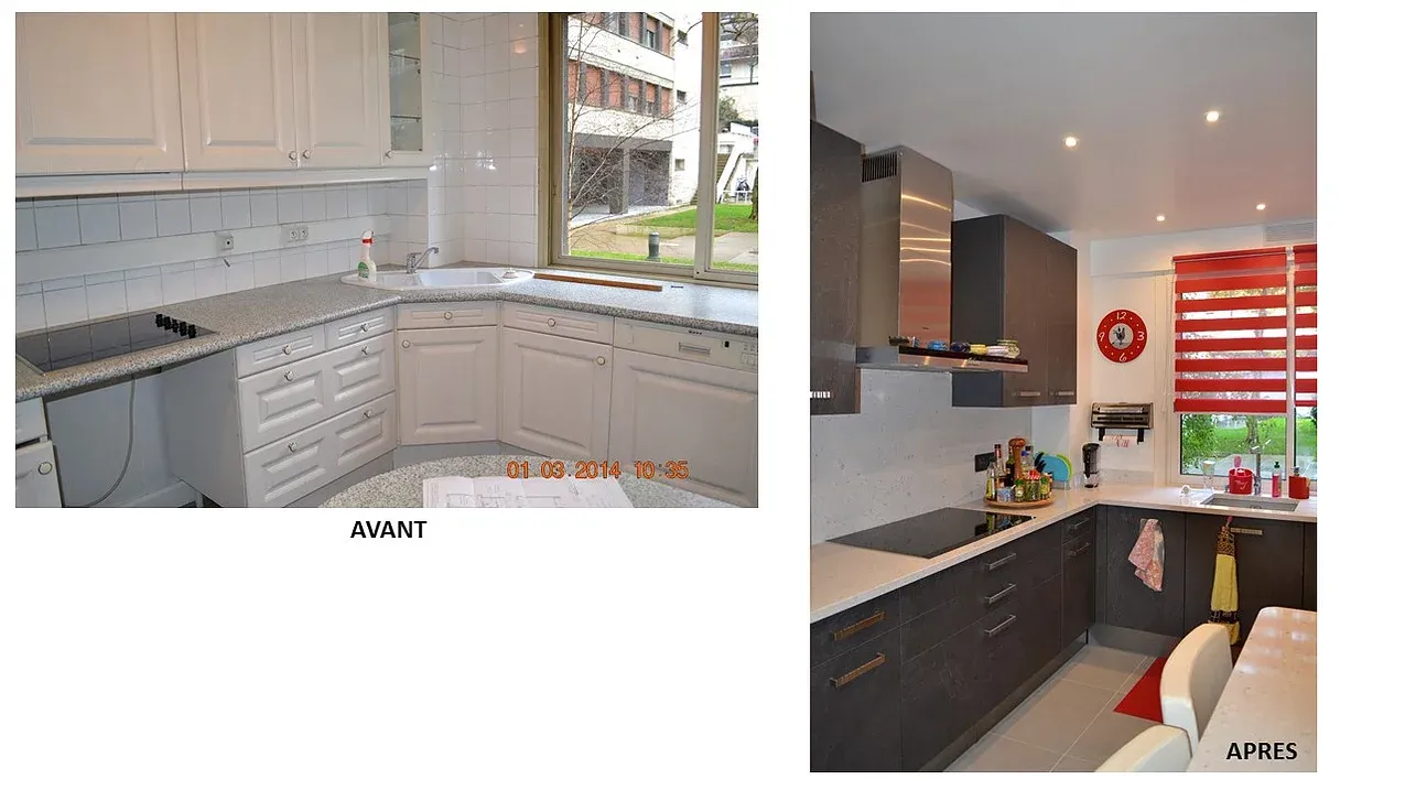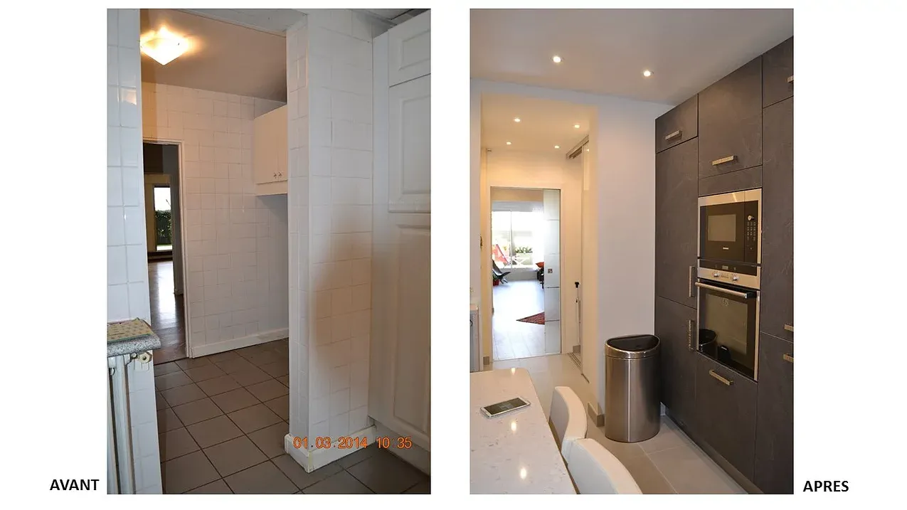 - La cuisine complètement refaite. La porte avant ouvrante a été remplacé par une coulissante en verre pour laisser passer la lumière.