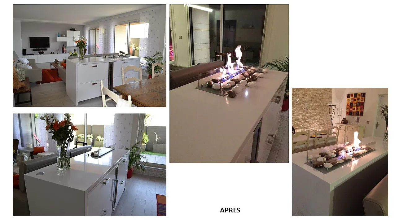 - Le meuble TV du séjour a été dessiné et fait sur mesure pour cet espace ainsi que le meuble cheminée.