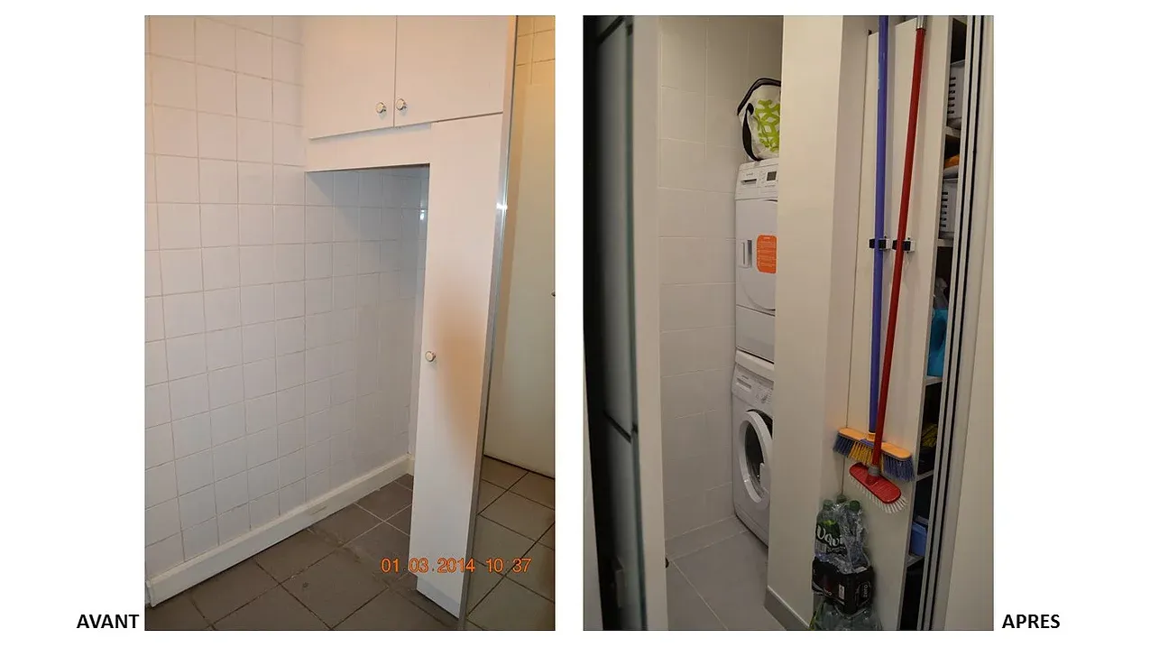 - L'office a été modifié pour créer un espace buanderie, séparé et caché par des portes coulissantes du sol au plafond.