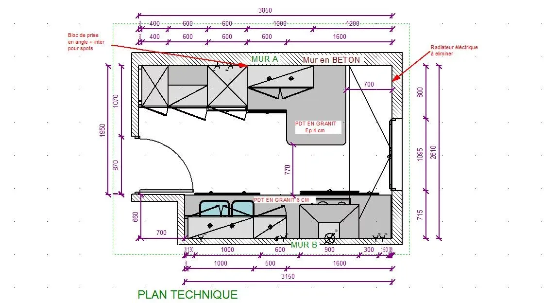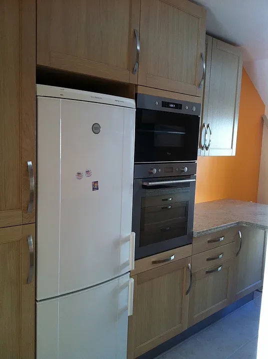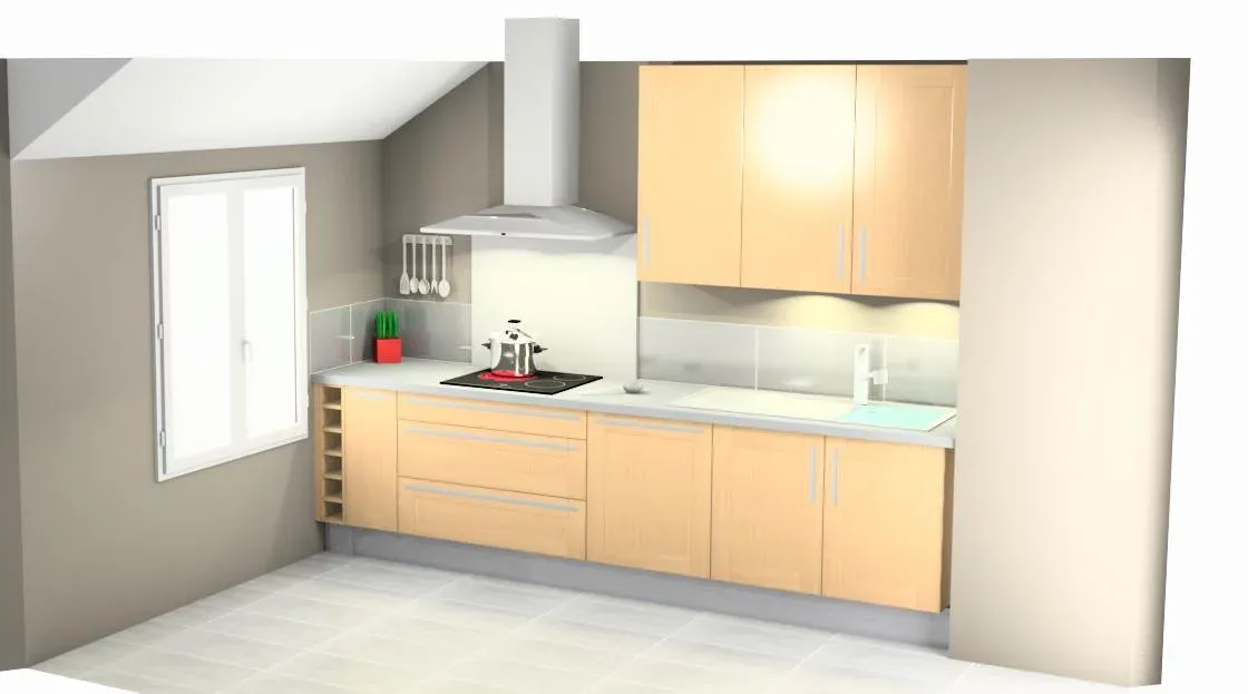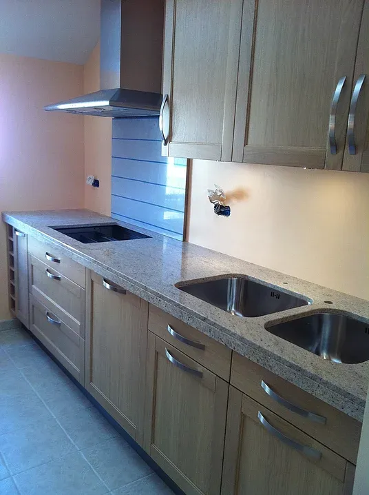 Rénovation de cuisine en placage bois et plan de travail en granit.