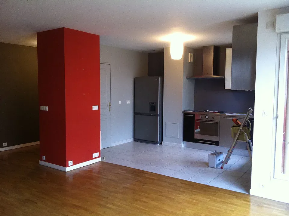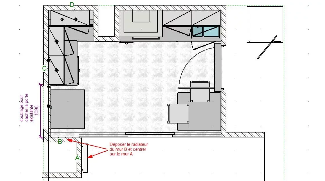 1) Condamner la porte et utiliser tout ce mur pour agrandir la pièce et ainsi créer des rangements et un plan de travail supplémentaire.