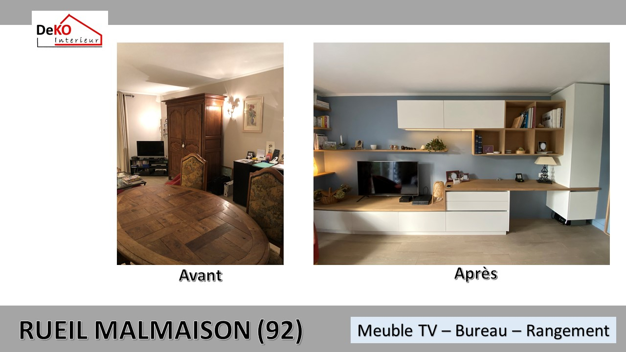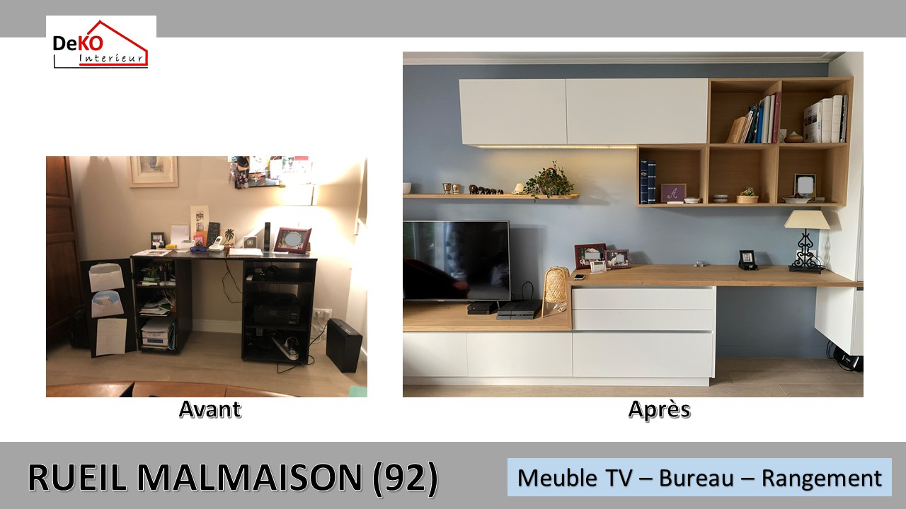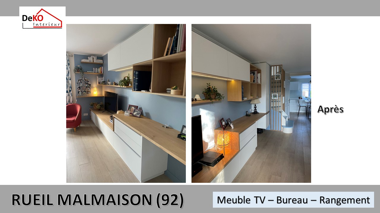 Ce projet de rénovation a consisté en la conception d'un meuble multifonctionnel sur mesure, intégrant une bibliothèque, un bureau avec des rangements et un espace pour la télévision.