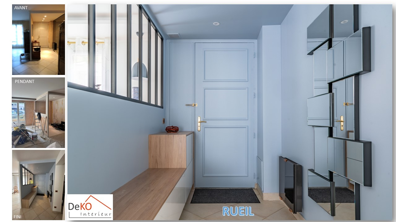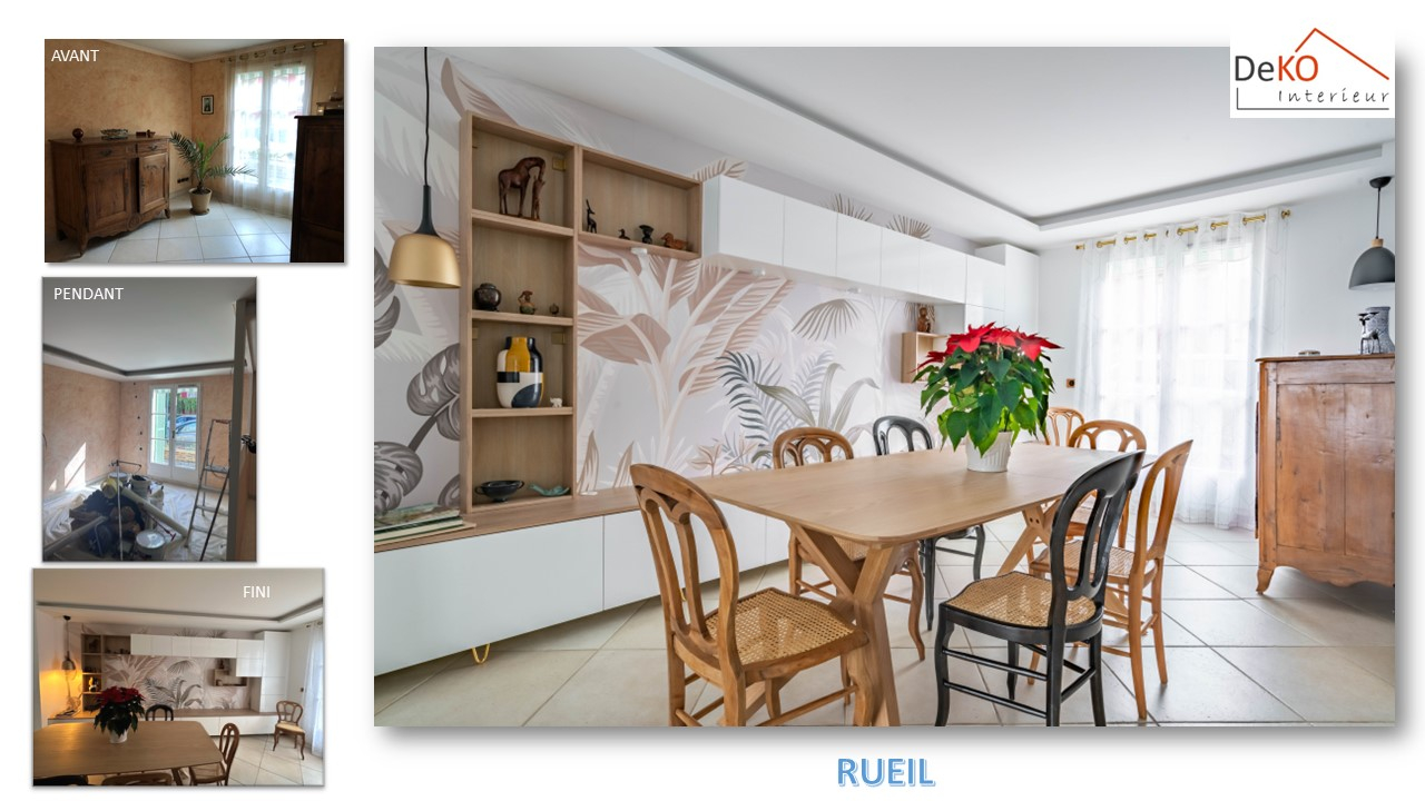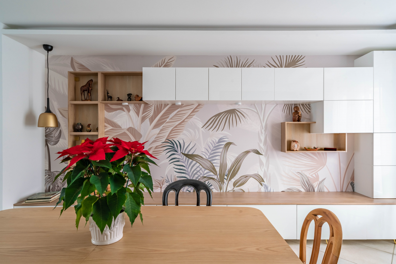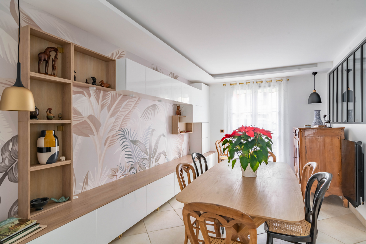Pour finaliser le tout, la couleur jaune des murs a été remplacé par du blanc plus lumineux, et quelques touches de couleurs avec un bleu dans l’entrée et un beau papier peint panoramique pour la salle à manger.