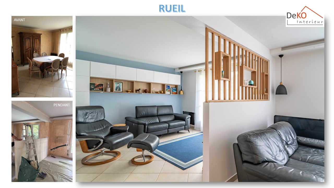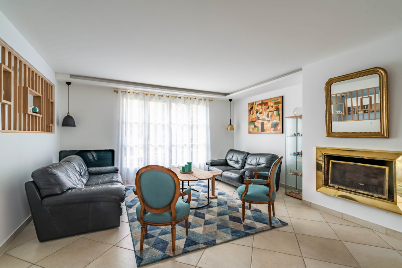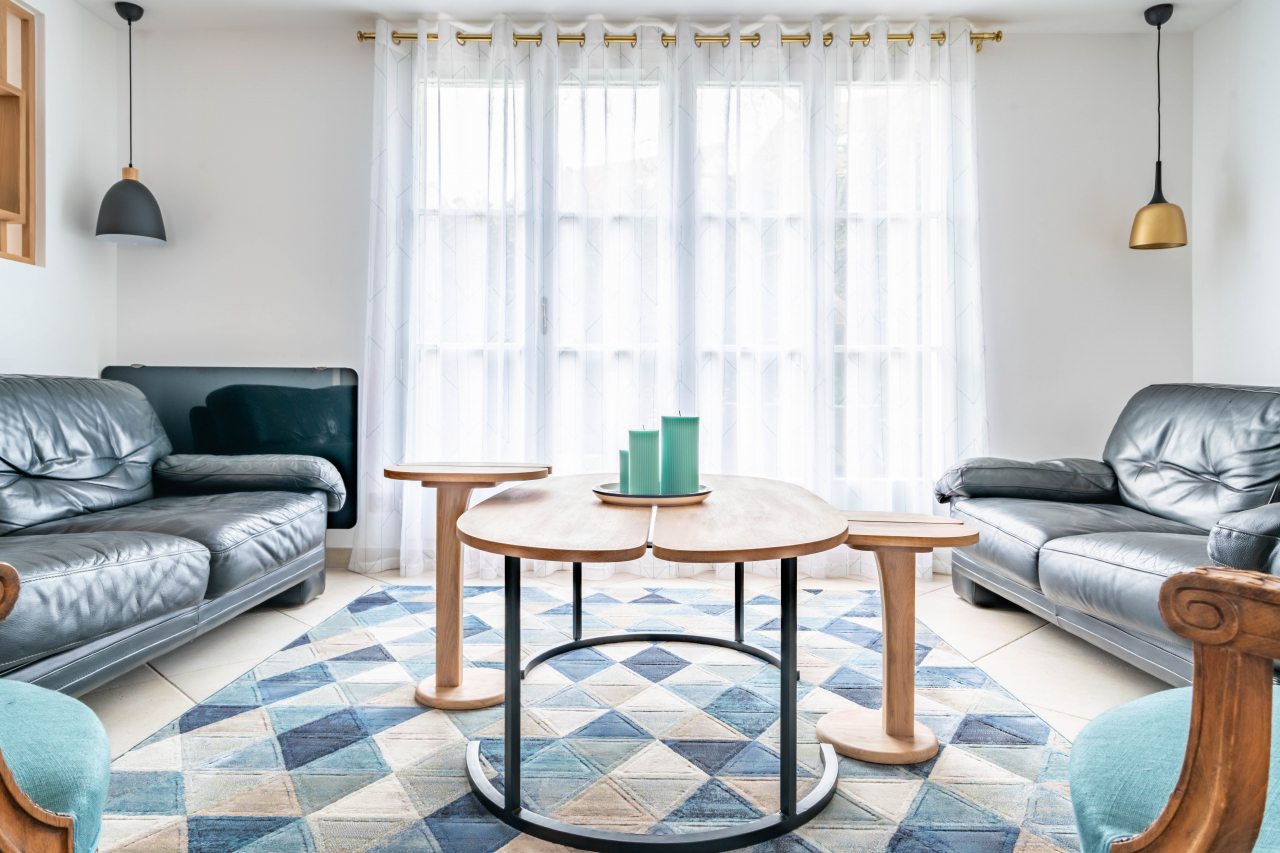 Le salon précédent, peu accueillant avec ses deux grands canapés et deux fauteuils encombrants, ainsi qu'un petit meuble abritant une télévision, a été réaménagé pour une meilleure fonctionnalité.