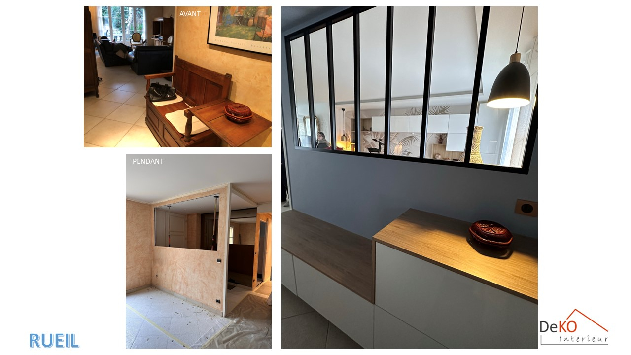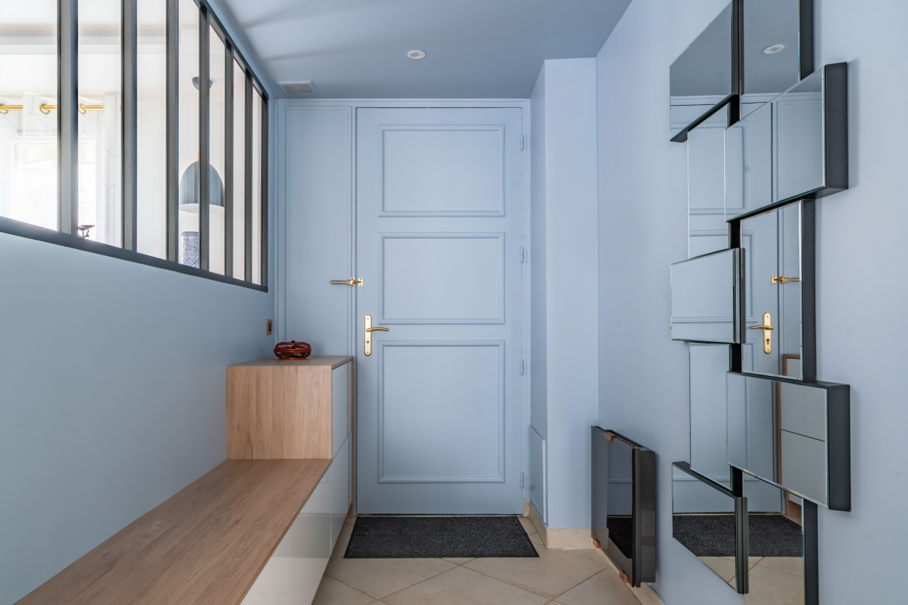 L'entrée, désormais lumineuse grâce à une verrière, est équipée d'un banc pour se chausser ainsi que d'un vide-poche.