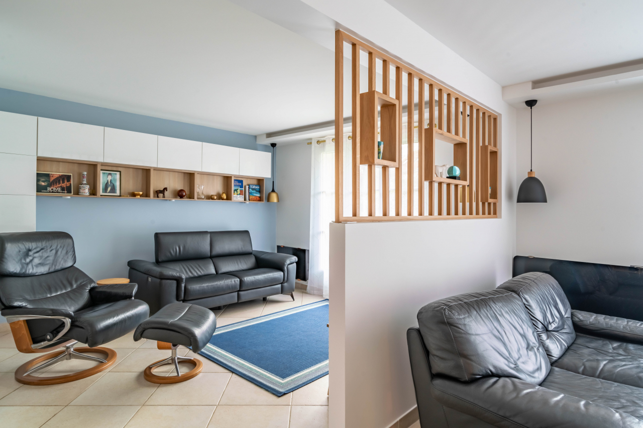 Malgré une séparation par une cloison et un claustra, l'espace apparaît désormais plus vaste, offrant un lieu idéal pour se détendre.