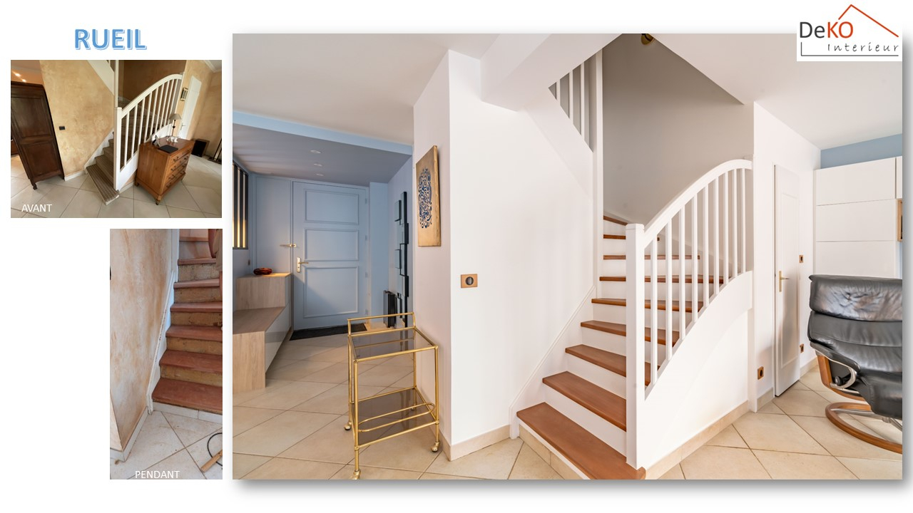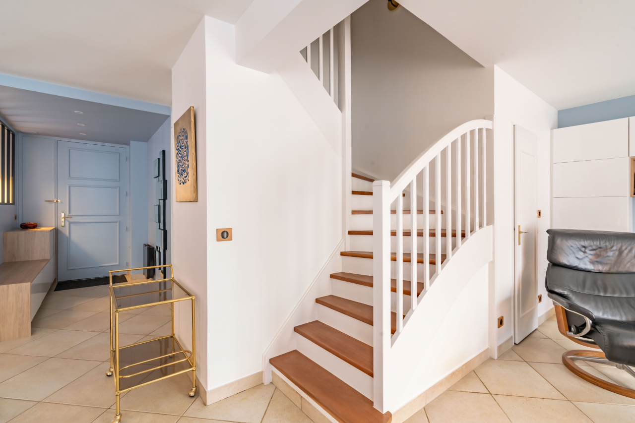 L'escalier, autrefois dissimulé sous une moquette, a été restauré pour mettre en valeur son bois d'origine.