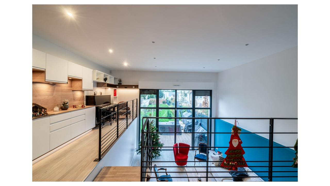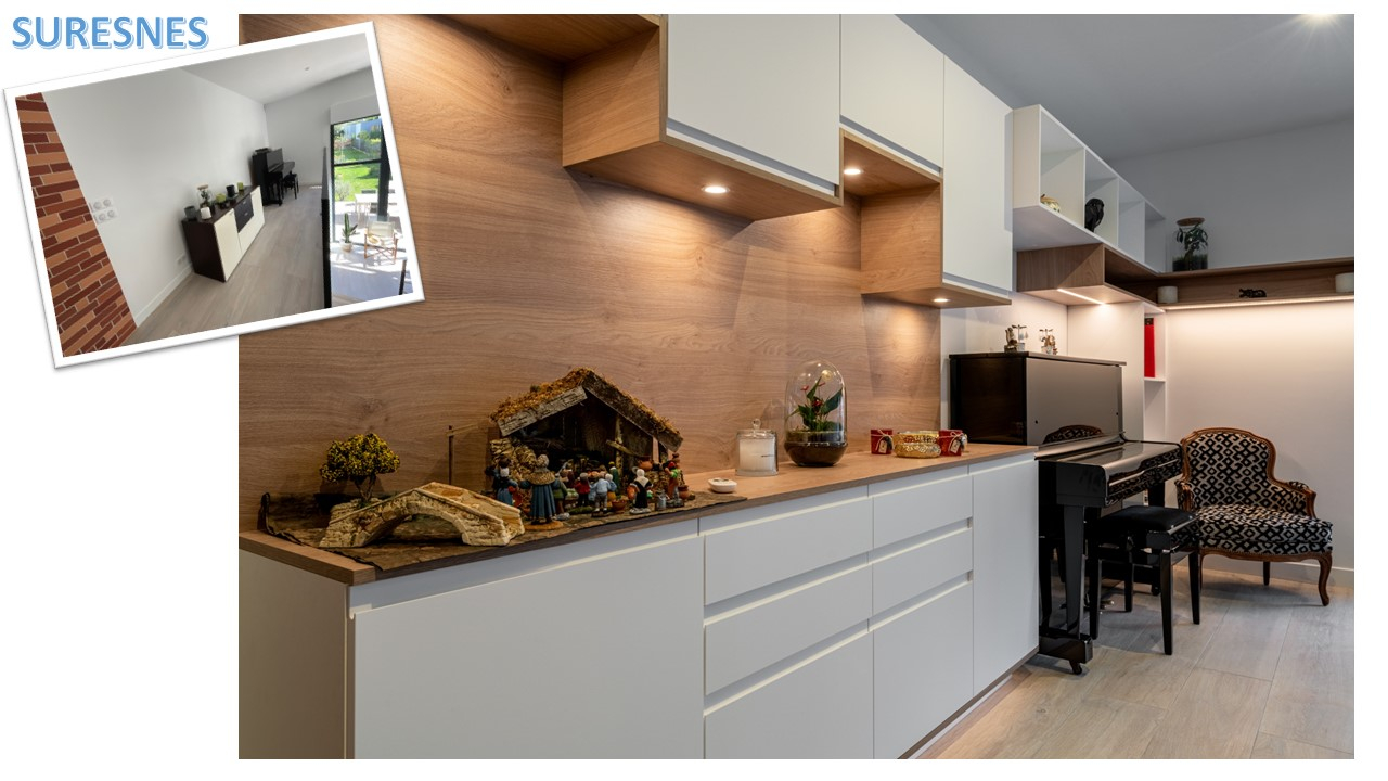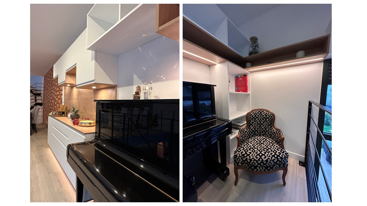 Dans cette nouvelle maison, le séjour manquait cruellement d'âme. Son vaste volume rendait difficile son aménagement optimal. En intervenant, j'ai choisi de renverser la donne : positionner le canapé face à l'escalier, transformant ainsi cet espace en un accueil chaleureux dès l'entrée, tout en dissimulant discrètement la télévision sous l'escalier. L'utilisation de meubles du commerce a permis de créer un banc accueillant, offrant également un espace de rangement et une bibliothèque, avec des jeux de couleurs pour délimiter et distinguer les espaces. Quant au coin piano /bibliothèque, initialement était un couloir vide, il a été métamorphosé par l'ajout d'une bibliothèque fonctionnelle et cosy et d'un buffet attenant à la salle à manger, apportant ainsi élégance et luminosité à cet espace autrefois délaissé. Découvrez comment chaque choix a été pensé pour donner vie et caractère à ce séjour.