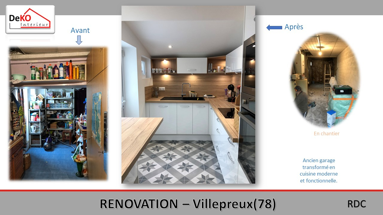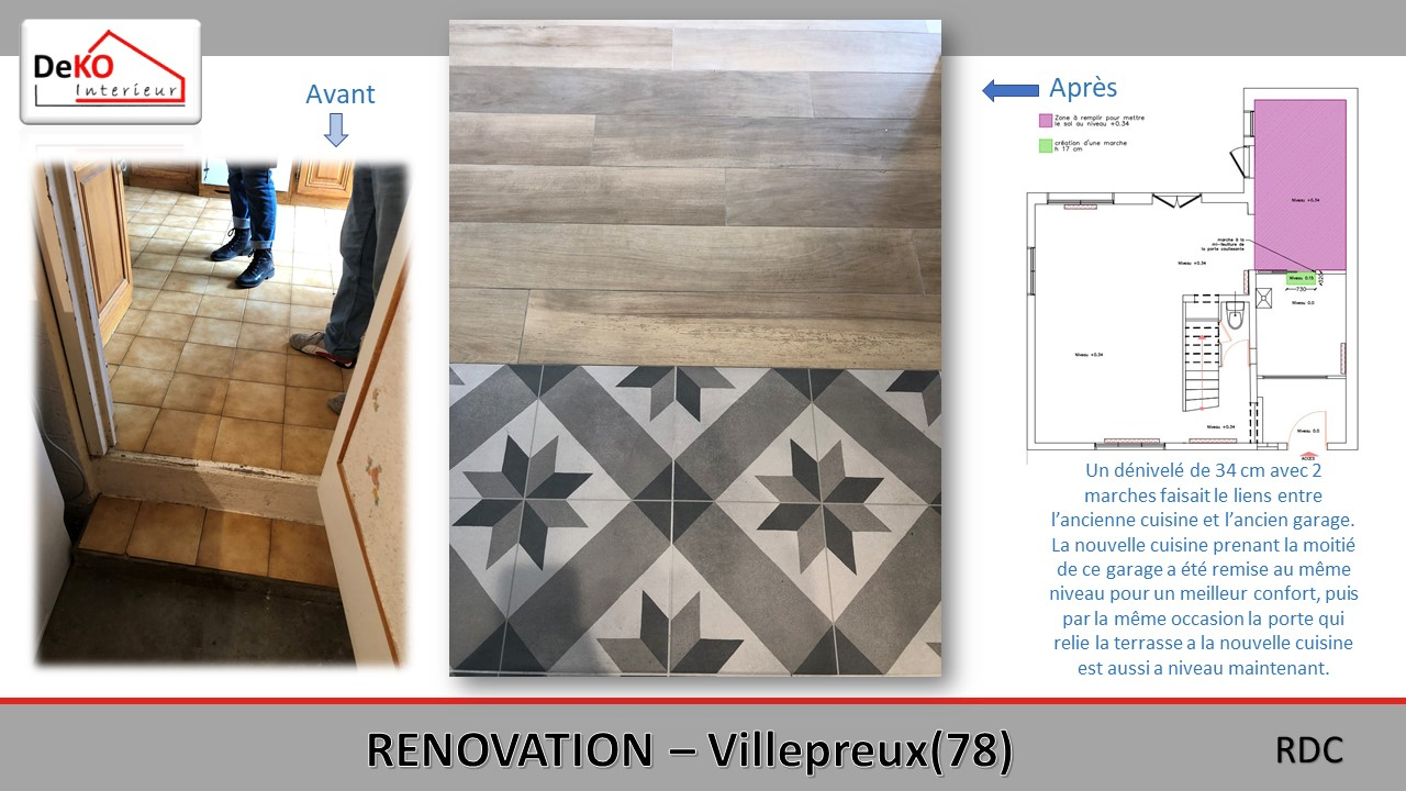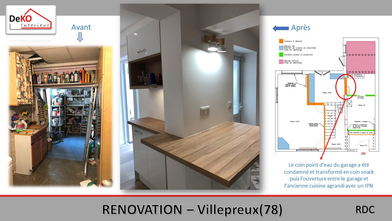 L'ancien garage, situé en dénivelé par rapport au reste du séjour, a été comblé pour devenir l'espace cuisine en continuité de la salle à manger.