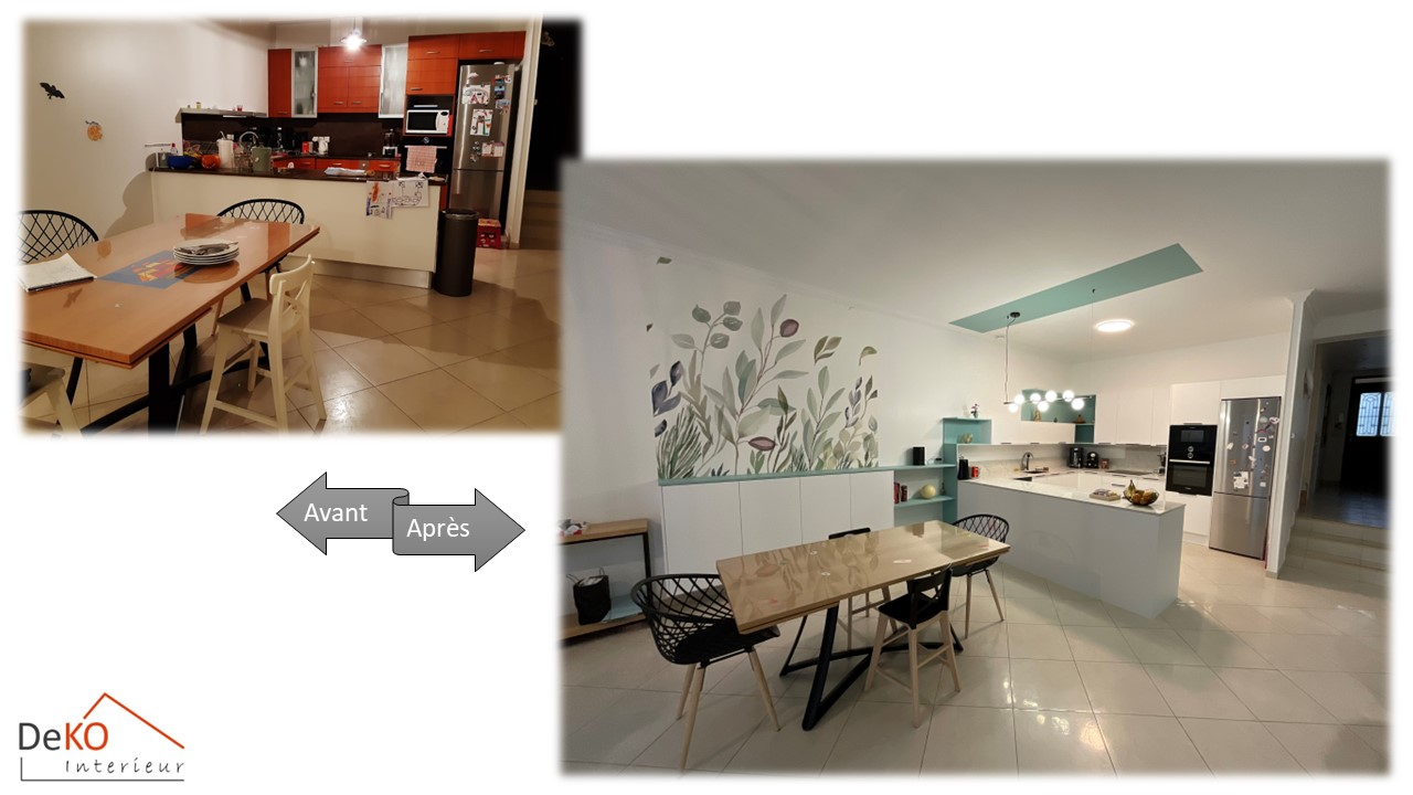 Notre projet a débuté par un changement radical de la cuisine et du plan bar qui sépare astucieusement la cuisine de la salle à manger.