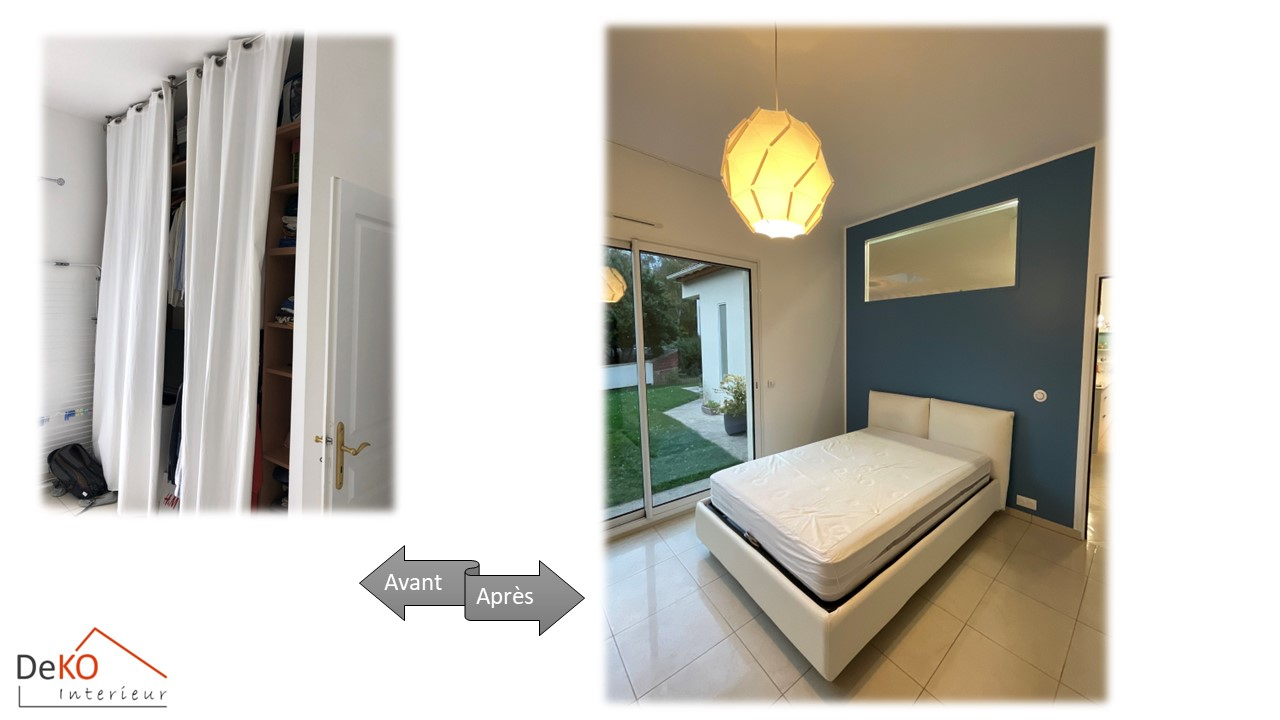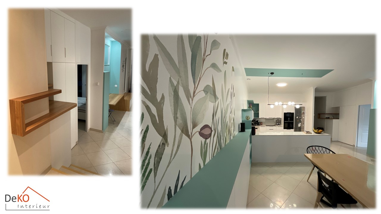 Attenant au plan bar séparatif de la cuisine un superbe papier peint mural panoramique a été judicieusement positionné pour délimiter visuellement la salle à manger et le séjour, ajoutant une touche d'élégance à l'ensemble. Enfin, la chambre parentale a été métamorphosée pour accueillir un grand dressing moderne et spacieux, intégrant astucieusement un coin télévision et des solutions de rangement innovantes.
