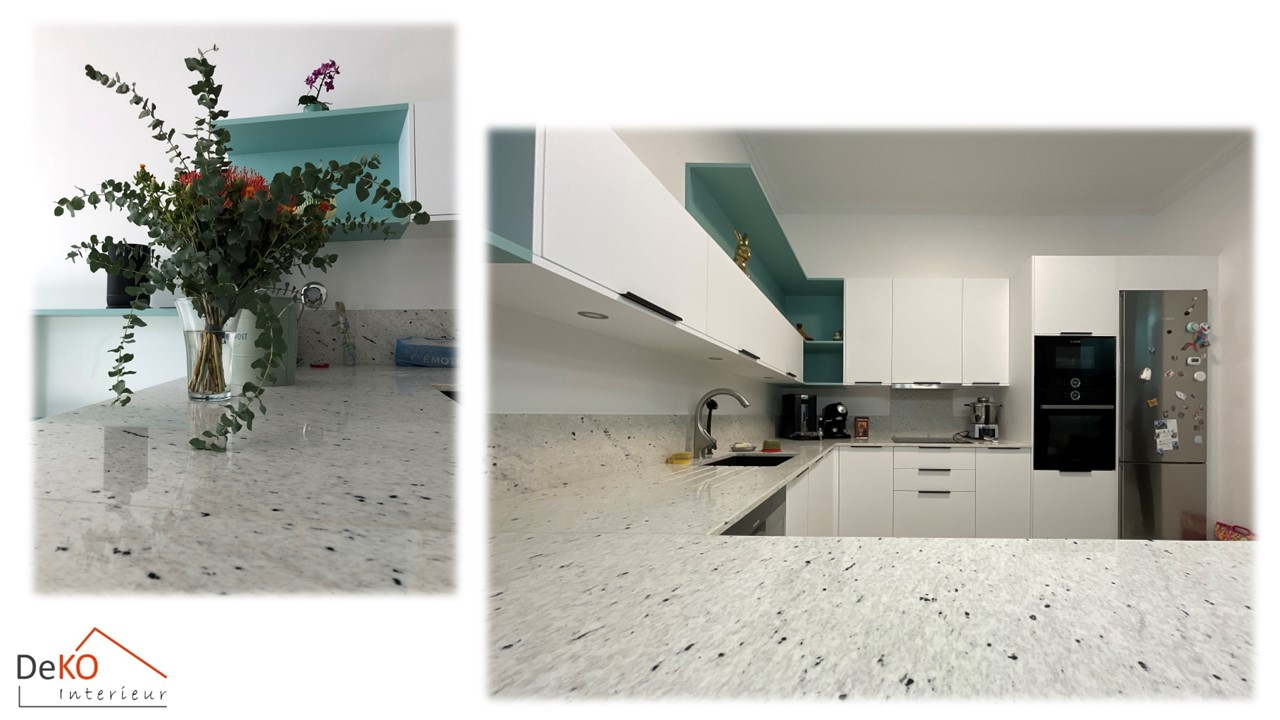 Autrefois revêtue d’une teinte bois foncé avec un granit pas lumineux, ce qui donnez une ambiance sombre car cette pièce se trouve éloignée des fenêtres.