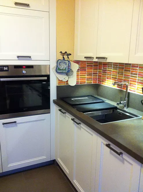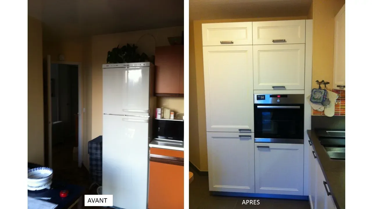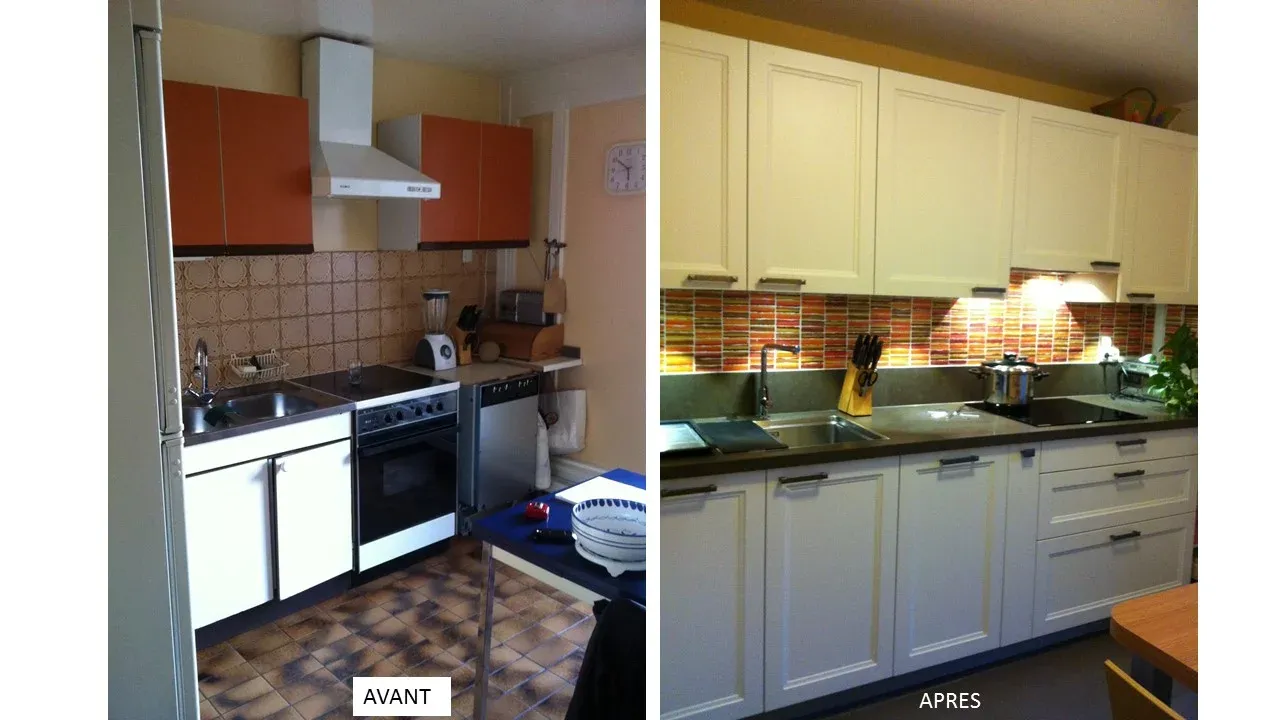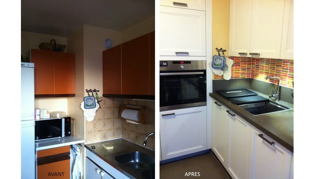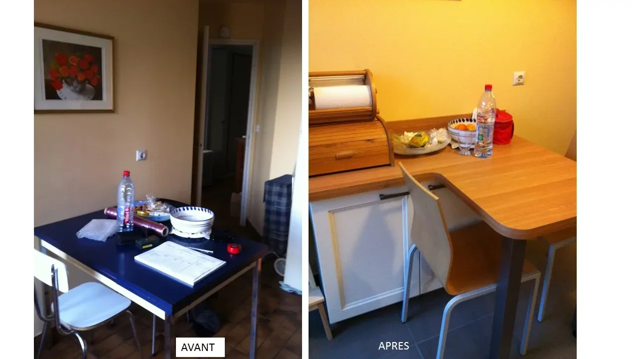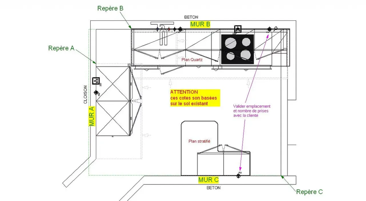 Cuisine a cadre en bois laqué avec plan de travail en quartz et coin table en stratifié coloris bois.