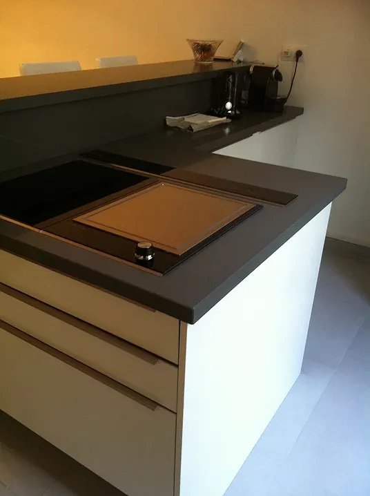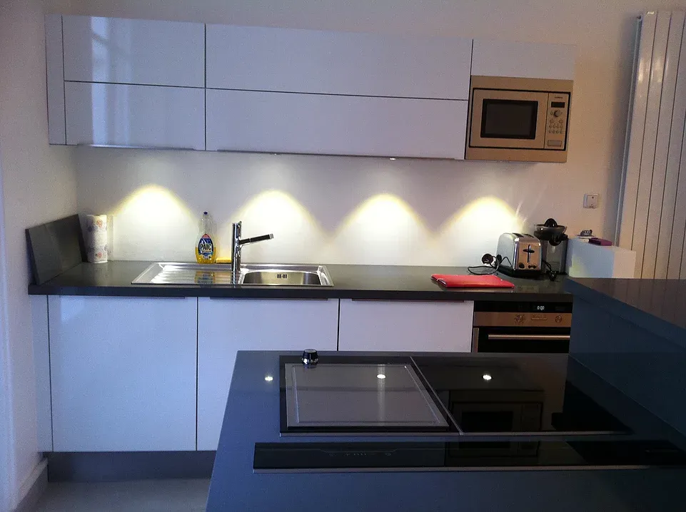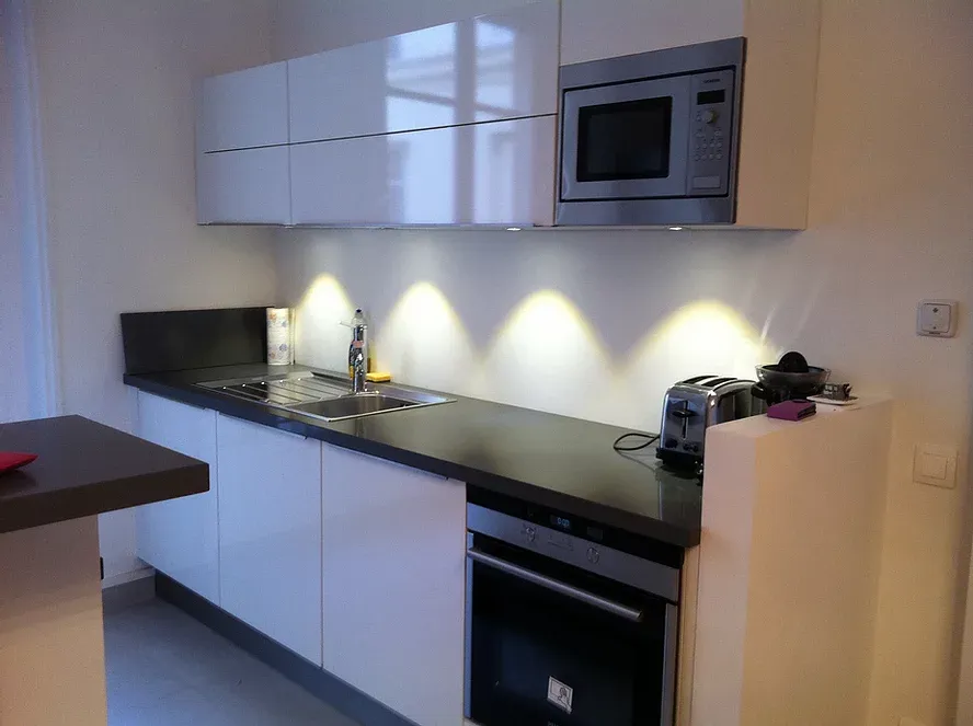 Portes en stratifié brillant et plan de travail en quartz.